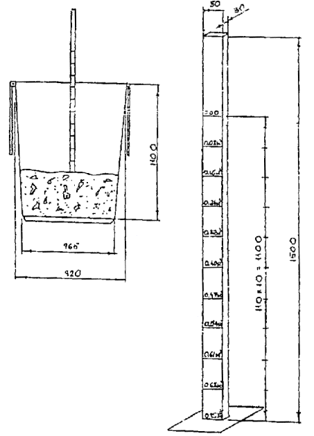 Схема рейки для определения объема твердых бытовых отходов в контейнере 21. После обработки первичных материалов по замерам полученные данные (касса, объем) для каждой однородной группы объектов суммируются по дням недели и заносятся в сводную месячную (сезонную) ведомость накопления (форма 4 приложения). РАСЧЕТ НОРМ НАКОПЛЕНИЯ ОТХОДОВ22. Определение суточной нормы накопления на 1 чел. в объемных показателях и по массе за сезон производится по формулам (1) и (2): где Vc.c - суточное накопление отходов, л/чел.; Vo - объем удаляемых отходов с изучаемого объекта за период определения, л; n - число проживающих, чел.; a - продолжительность определения норм накопления (7 сут); где Gc.c - суточное накопление отходов, кг/чел.; Go - масса удаляемых отходов с изучаемого объекта за период определения норм, кг. 23. Среднемесячное (сезонное) накопление отходов используется для расчета среднесезонных и годовых показателей накопления отходов, а также их средней плотности и наибольших коэффициентов неравномерности (форма 5 приложения). 24. Определение среднегодовой суточной нормы накопления на 1 чел. в объемных показателях и по массе производится по формулам (3) и (4): где Vo - среднесезонная суточная норма накопления, л/чел.; з, в, л, о - индексы, обозначающие сезоны года - зима, весна, лето, осень; 4 - количество сезонов; где Gδ - среднесезонная суточная норма накопления, кг/чел. 25. Определение годовой нормы накопления на 1 чел. в объемных показателях и по массе производится по формулам (5) и (6): V2 = Vδ × 365, (5) где V2 - годовая норма накопления, л/чел.; 365 - число суток в году; G2 = Gδ × 365, (6) где G2 - годовая норма накопления, кг/чел. 26. Средняя плотность отходов определяется по формуле (7): где γ - средняя плотность отходов, кг/л или кг/м3. 27. Наибольшие годовые коэффициенты неравномерности накопления отходов по объему и массе определяются по формулам (8) и (9): где K - коэффициент суточной неравномерности накопления отходов по объему; VMc.c - наибольшее суточное накопление отходов, л/чел.; где K1 - коэффициент суточной неравномерности накопления отходов по массе; GMс.с - наибольшее суточное накопление отходов, кг/чел. 28. В случае применения на выбранных участках раздельного сбора отдельных составляющих отходов (пищевые отходы, бумага и т.д.) количество их добавляется к полученным нормам накопления. Это обеспечивает правильность взаиморасчетов. Например, вывоз пищевых отходов осуществляется спецавтохозяйствами бесплатно, но их количество учитывается в общих нормах накопления. 29. Обработка данных по определению накопления отходов производится в тот же день, но не позже, чем на другой день после замеров, и в случае получения сомнительных данных принимаются меры к выяснению причин отклонения и их устранению. 30. Работы по уточнению норм накопления твердых бытовых отходов целесообразно проводить каждые 5 лет. ПРИЛОЖЕНИЯПриложение 1Оборудование, необходимое для определения норм накопления твердых бытовых отходов1. Мерная линейка на 1,5 м 2. Автомобильные весы А-10 с пределом измерения до 10 кг, точность ±5 кг 3. Динамометры на 500 кг, марка ДПУ-0,5/2, точность ±5 кг Приложение 2Форма 1