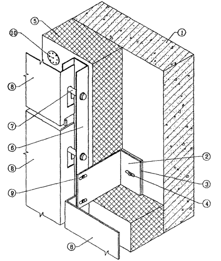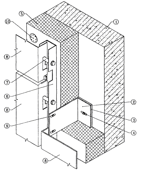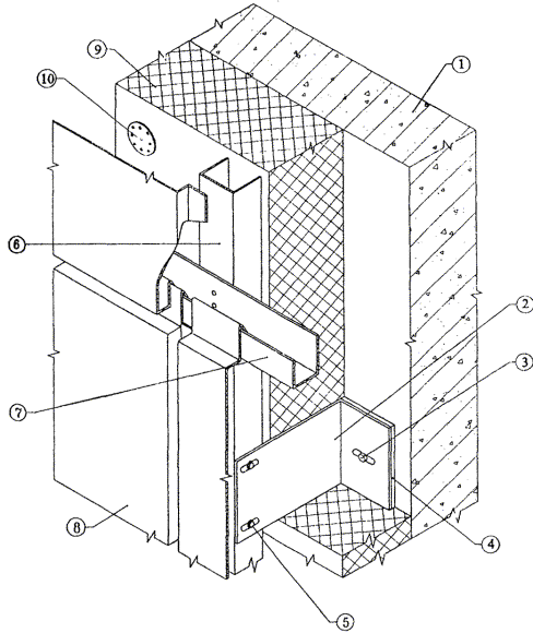 1. Основание. 2. Несущий кронштейн. 3. Анкерный болт. 4. Паронитовая прокладка. 5. Шуруп-саморез. 6. Вертикальный профиль. 7. Горизонтальный профиль. 8. Облицовочная панель «ТРИОЛ-КУ». 9. Утеплитель. 10. Тарельчатый дюбель. Рис. 3.3. Фасадная система «ТРИОЛ-КУ»