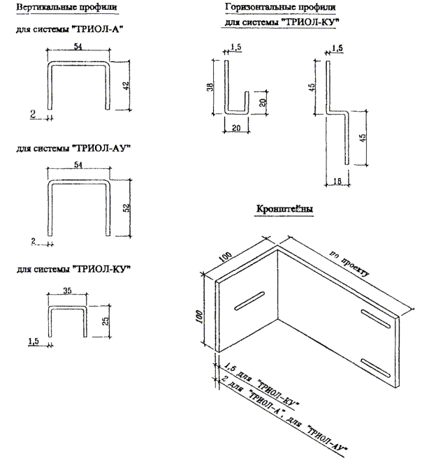 Рис. 1.2. Здание холодильника, ул. Рябиновая, д. 43, г. Москва Рис. 1.3. Универсам «Копейка», ул. Ясногорская, д. 2, г. Москва 3. Конструктивное решение системы3.1. Система, являясь многослойной конструкцией, включает следующие элементы: металлический несущий каркас, прикрепленный к основанию (несущим конструкциям наружной стены), слой негорючего минераловатного утеплителя, укрытого, в случае необходимости, пленкой типа «TYVEK»* и также вместе с пленкой, закрепленного на основании, и фасадную облицовку здания в виде металлических кассетных панелей, прикрепленных к несущему каркасу. Между кассетными панелями и слоем утеплителя устроен вентилируемый воздушный зазор, благодаря которому влага в виде пара, мигрирующая из помещений, удаляется из утеплителя. ___________ * Пленка условно на чертежах не показана. 3.2. Возможно применение системы только для отделки здания. В этом случае слой утеплителя отсутствует. 3.3. Система «ТРИОЛ» может быть выполнена в виде одной из трех подсистем: металлические элементы подсистем «ТРИОЛ-А» и «ТРИОЛ-АУ» выполняются из алюминиевых сплавов, а подсистема «ТРИОЛ-КУ» - из стального оцинкованного листового материала (рис. 3.1-3.3). 3.4. Несущий каркас системы состоит из кронштейнов, прикрепленных к основанию анкерными болтами, и вертикальных профилей, которые крепятся к кронштейнам саморезами. В подсистемах «ТРИОЛ-А» и «ТРИОЛ-АУ» вертикальные профили снабжаются штифтами для навески кассетных панелей, а в подсистеме «ТРИОЛ-КУ» для навески кассетных панелей применяют горизонтальный профиль, прикрепленный саморезами к вертикальному профилю. 3.5. В системе применяются стальные оцинкованные кронштейны в форме уголка с полками разной длины (рис. 3.4). На одной полке - отверстие под анкерный болт для крепления кронштейна к основанию, а на другой - одно или два отверстия для крепления к кронштейну вертикального профиля. Все отверстия овальной формы, что позволяет устанавливать (регулировать) вертикальный профиль строго по вертикали и в плоскости фасада, и в плоскости, перпендикулярной фасаду. Для снижения теплопередачи через кронштейн между ним и основанием устанавливается паронитовая прокладка. Кронштейн изготавливают адресно для конкретного проекта с учетом толщины слоя утеплителя и воздушного зазора, отклонений основания от вертикальной плоскости и т.п. Поэтому длина полки кронштейна, к которой крепят вертикальный профиль, может быть разной. Кроме того, часть кронштейнов рассчитывают на вертикальные (собственный вес системы) и горизонтальные (ветровые) нагрузки, а остальные - только на горизонтальные, при этом последние соединяются с вертикальными профилями так, чтобы позволить ему перемещаться относительно кронштейна вследствие температурных деформаций. 3.6. В системе применяют вертикальные профили «П»-образного сечения. В подсистемах «ТРИОЛ-А» и «ТРИОЛ-АУ» вертикальные профили прессованные из алюминиевых сплавов, а в подсистеме «ТРИОЛ-КУ» - гнутые из стальных оцинкованных листов. Размеры поперечных сечений вертикальных профилей приведены на рис. 3.4. 3.7. Кассетные панели изготавливают из листового металла, который сначала кроят, а затем сгибают. В результате получается изделие в виде ящика с низкими стенками (горизонтальными и вертикальными боковыми гранями). Готовое изделие по специальной технологии покрывается со