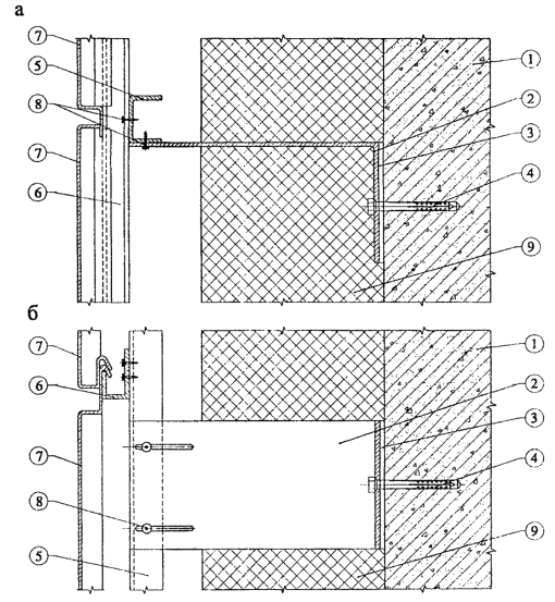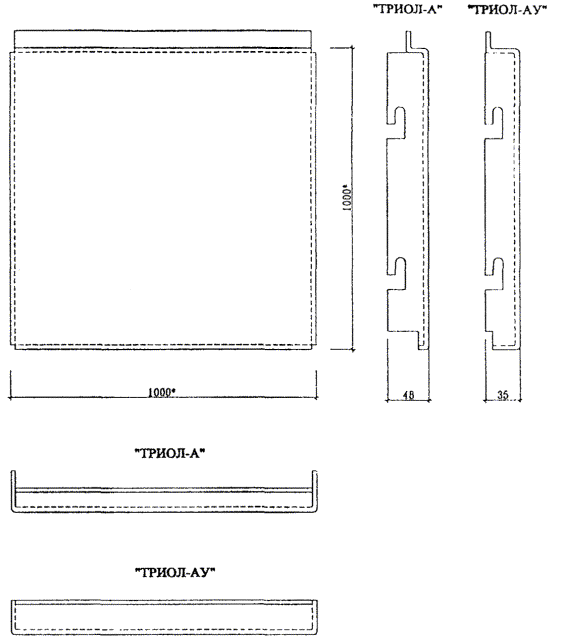 Рис. 3.4. Кронштейны, вертикальные и горизонтальные профили систем «ТРИОЛ» * Размеры панелей определяются проектом. Рис. 3.5. Кассетные панели из алюминия для подсистем «ТРИОЛ-А», «ТРИОЛ-АУ» * Размеры панелей определяются проектом. Рис. 3.6. Кассетная панель из оцинкованной стали для подсистем «ТРИОЛ-КУ» 1. Основание. 2. Кронштейн несущий. 3. Паронитовая прокладка. 4. Анкерный болт. 5. Утеплитель. 6. Вертикальный профиль. 7. Штифт с блокировочными шайбами. 8. Облицовочная панель «ТРИОЛ-А». 9. Шуруп-саморез. Рис. 3.7. Фасадная система «ТРИОЛ-А» а - горизонтальный разрез; б - вертикальный разрез 1. Основание. 2. Кронштейн несущий. 3. Паронитовая прокладка. 4. Анкерный болт. 5. Утеплитель. 6. Вертикальный профиль. 7. Штифт с блокировочными шайбами. 8. Облицовочная панель «ТРИОЛ-АУ». 9. Шуруп-саморез. Рис. 3.8. Фасадная система «ТРИОЛ-АУ» а - горизонтальный разрез; б - вертикальный разрез 1. Основание. 2. Кронштейн несущий. 3. Паронитовая прокладка. 4. Анкерный болт. 5. Вертикальный профиль. 6. Горизонтальный профиль. 7. Облицовочная панель «ТРИОЛ-КУ». 8. Шуруп-саморез. 9. Утеплитель. Рис. 3.9. Фасадная система «ТРИОЛ-КУ» а - горизонтальный разрез; б - вертикальный разрез 1. Основание. 2. Кронштейн несущий. 3. Паронитовая прокладка. 4. Анкерный болт. 5. Утеплитель. 6. Вертикальный профиль. 7. Штифт с блокировочными шайбами. 8. Облицовочная панель «ТРИОЛ-А». 9. Шуруп-саморез. 10. Угловая облицовочная панель «ТРИОЛ-А». Рис. 3.10. Подсистема «ТРИОЛ-А» на внешнем углу здания