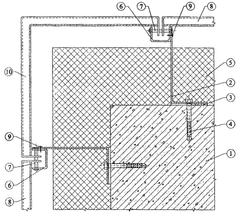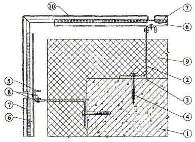 1. Основание. 2. Кронштейн несущий. 3. Паронитовая прокладка. 4. Анкерный болт. 5. Вертикальный профиль. 6. Горизонтальный профиль. 7. Облицовочная панель «ТРИОЛ-КУ». 8. Шуруп-саморез. 9. Утеплитель. 10. Угловая облицовочная панель «ТРИОЛ-КУ». Рис. 3.13. Фасадная система «ТРИОЛ-КУ» на наружном углу здания