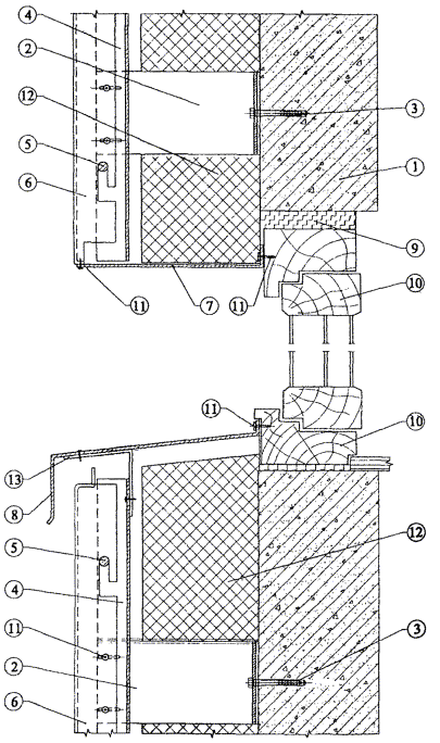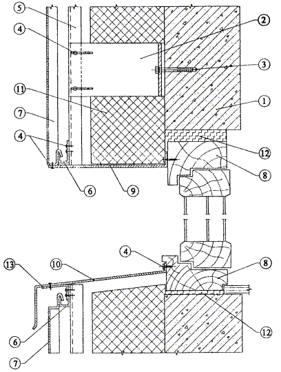1. Основание. 2. Кронштейн несущий. 3. Ликерный болт. 4. Вертикальный профиль. 5. Штифт с блокировочными шайбами. 6. Облицовочная панель «ТРИОЛ-А». 7. Оконное обрамление из оцинкованной стали. 8. Слив из оцинкованной стали. 9. Пеноутеплитель «Макрофлекс». 10. Оконный блок. 11. Шуруп-саморез. 12. Утеплитель. 13. Специальный кронштейн. Рис. 3.12. Подсистема «ТРИОЛ-А» у оконного проема