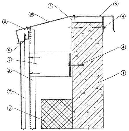 1. Основание. 2. Кронштейн. 3. Анкерный болт. 4. Утеплитель. 5. Вертикальный профиль. 6. Горизонтальный профиль. 7. Облицовочная панель «ТРИОЛ-КУ». 8. Козырек с перфорацией. 9. Шуруп-саморез. Рис. 3.16. Фасадная система «ТРИОЛ-КУ» у цоколя 1. Основание. 2. Несущий кронштейн. 3. Утеплитель. 4. Анкерный болт. 5. Вертикальный профиль. 6. Горизонтальный профиль. 7. Облицовочная панель «ТРИОЛ-КУ». 8. Специальный кронштейн. 9. Шуруп-саморез. 10. Покрытие. Рис. 3.17. Фасадная система «ТРИОЛ-КУ» на парапете