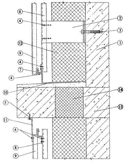 1. Основание. 2. Кронштейн несущий. 3. Анкерный болт. 4. Шуруп-саморез. 5. Анкерный винт. 6. Вертикальный профиль. 7. Горизонтальный профиль. 8. Z - образный горизонтальный профиль. 9. Облицовочная панель «ТРИОЛ-КУ». 10. Перфорированная пластина над плитой. 11. Перфорированная пластина под плитой. 12. Утеплитель. 13. Балконная плита. 14. Утеплитель в проемах балконной плиты. Рис. 3.18. Фасадная система «ТРИОЛ-КУ» у балконной плиты (козырька)