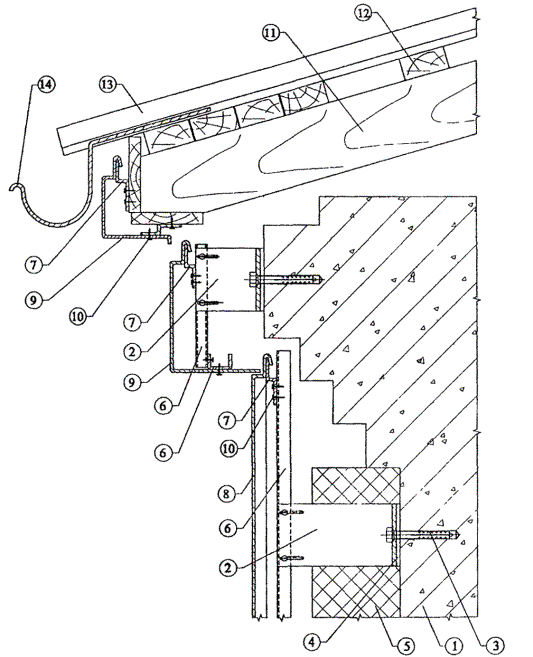 1. Основание. 2. Кронштейн. 3. Анкерный болт. 4. Паронитовая прокладка. 5. Утеплитель. 6. Вертикальный профиль. 7. Z-образный горизонтальный профиль. 8. Облицовочная панель «ТРИОЛ-КУ». 9. Карнизная панель «ТРИОЛ-КУ». 10. Шуруп-саморез. 11. Кобылка. 12. Обрешетка. 13. Кровля. 14. Желоб. Рис. 3.19. Фасадная система «ТРИОЛ-КУ» у карниза 4. Исходные данные для проектирования системы4.1. Проектно-сметная документация на систему для конкретного объекта разрабатывается на основе задания на проектирование, подготовленного в соответствии с существующим в г. Москве порядком и утвержденного заказчиком. Задание на проектирование обязательно должно содержать требование о соответствии системы II этапу энергосбережений СНиП II-3-79* (изд. 1998 г.) и МГСН 2.01-99. 4.2. Задание на проектирование системы должно включать следующие исходные данные: - архитектурные чертежи фасадов здания, включающие данные о фактуре и цвете облицовочных материалов, чертежи архитектурных деталей (карнизов, обрамления проемов и т.п.) и другие необходимые данные, если это не входит в состав работ по данному заданию; - строительные чертежи наружных стен от фундаментов до парапетов, включая узлы, поясняющие решение и размеры всех конструкций; - данные от разработчиков фундаментов о величине допустимой дополнительной нагрузки на стены здания или, в случае реконструкции здания, заключение компетентной организации о несущей способности фундаментов здания; - план участка, где расположено здание. Для реконструируемых зданий задание на проектирование дополнительно должно содержать акт обследования наружных стен здания, где указывается состояние поверхности фасадов, результаты испытаний на усилия, с которым принятые дюбели можно вырвать из стены и геодезическую съемку поверхностей фасадов с данными о величине отклонений их отдельных участков от вертикальной плоскости. 4.3. К заданию на проектирование должно быть приложено Приложение к Техническому свидетельству Госстроя России на эту фасадную систему. 5. Определение основных параметров системы5.1. К основным параметрам системы следует отнести: - тип и размер облицовочных материалов и способ их крепления к несущему каркасу; - характеристику принятых плит утеплителя: марку, размеры, плотность, теплопроводность, наличие или отсутствие защитного слоя; величину воздушного зазора; - схему размещения на фасаде здания кронштейнов и вертикальных профилей, а для системы «ТРИОЛ-КУ» и горизонтальных профилей со всеми необходимыми размерами, в том числе, расстояние от основания до экрана; - марку дюбелей для крепления кронштейнов несущего каркаса к основанию; - марку дюбелей для крепления плит утеплителя к основанию. 5.2. Размер и цвет кассетных панелей определяет главный архитектор проекта, если эти данные не приведены в задании на проектирование системы. 5.3. Выбор плит утеплителя выполняется на основании теплотехнических расчетов, методика которых приводится ниже. Там же (в разделе «Теплотехнические расчеты») имеются рекомендации по определению величины воздушного зазора. В случае применения плит утеплителя с кашированной поверхностью можно обойтись без гидроветрозащитной мембраны. 5.4. Схема размещения на фасаде здания элементов несущего каркаса разрабатывается, исходя из следующих данных: - размеров по ширине кассетных панелей, вертикальный шов между