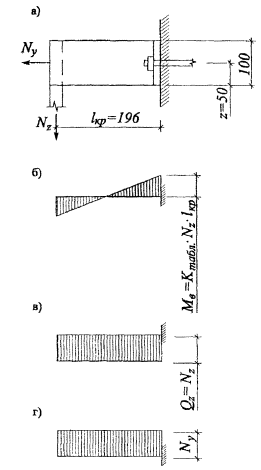 результирующее St = Проверка жесткости вертикального профиля Проверяется прогиб в направлении оси «у», т.е. по нормали к стене, от действия нормативной ветровой нагрузки руn = 508 Н/м, с изгибающим моментом на средней опоре Мnг = 50,8 Нм. По формулам строительной механики f = = f/l = 2,66/1000 = 1/376, что меньше предельно допустимой величины [f/l] = 1/200, жесткость профиля достаточна. 6.4.4. Расчет несущего кронштейна Геометрические характеристики Параметры поперечного сечения: h = 100 мм; d = 1,5 мм; А = 150 мм2; WX = 2500 мм3; Jx = 125000 мм4; Sx = 1875 мм3; tх = d = 1,5 мм; Wz = 37,5 мм3; Jz = 28,l мм4; Sz = 28,1 мм3; tz = 100 мм. Усилия От вертикальной нагрузки Qz = Nz = (pz + Sqw)×Lz = (80 + 9 + 10)×3 = 297 H; от горизонтальной нагрузки Ny = qy×lx×lz = 711×1×1 = 711 H. Плечо (вылет) lкр = 210 - 12,5 - 1,5 = 196 мм. Изгибающий момент от вертикальной нагрузки Мх = Ктабл×Nz lкр = 0,5×297×196×10-3 = 29,1 Нм. Проверка прочности на растяжение с изгибом и срез По формуле (50) [4] на растяжение с изгибом