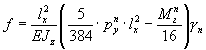 прочность продольных сечений на срез обеспечивается. Проверка прочности крепления горизонтального профиля к вертикальному Крепление производится двумя стальными саморезами d = 5 мм и do = 4 мм с расчетной площадью сечения 1 заклепки А = 12,6 мм2. Расчетные сопротивления по п. 2.2. Усилие растяжения, приходящееся на 1 саморез Ny(1) = gm×Ny/2 = 1,2×711/2 = 427 Н; усилие среза и смятия Nz(1) = gm×Qz/2 = 1,2×50/2 = 30 Н. По формуле (129) [4] на растяжение: Ny(1)×gn = 427×0,95 = 406 H < RвtA = 170×12,6 = 2142 Н; прочность соединения на растяжение обеспечивается. По формуле (127) на срез: Nz(1)×gn = 30×0,95 = 29 Н < Rвs×gв×Ans = 150×0,8×12,6×1 = 1512 Н; прочность соединения на срез обеспечивается. По формуле (128) на смятие Nz(1)×gn = 29 Н < Rlp×gс×d×St = 175×1×4×1,5 = 1050 Н; прочность элементов соединения на смятие обеспечивается. Проверка жесткости горизонтального профиля Проверяется прогиб в направлении оси «у», т.е. по нормали к стене, от действия нормативной ветровой нагрузки руn = 508 Н/м, с изгибающим моментом на средней опоре Mгn = 63,5 Нм. По формуле строительной механики для двухпролетной балки