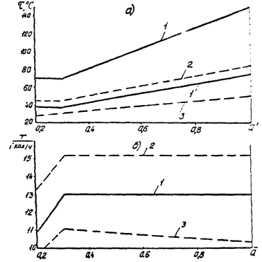 Причиной этого обычно является перерасход теплоносителя и ближних к источнику теплоты потребителей. Общий перерасход теплоносителя составляет, как правило, не мене 20 - 25 % расчетной нормы, что при соблюдении графика температур приводит к перерасходу теплоты на отопление в целом по сети в пределах 5 - 7 % (рис. 1, а и б). Как видно из рис. 1, б, удельный расход теплоносителя, принимаемый при расчете эксплуатационного графика в размере 13 т на 1 Гкал/ч, фактически составляет 15,2, а при автоматическом регулировании отпуска теплоты у потребителей может быть снижен до 11 т.