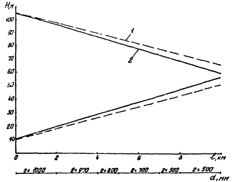 Результатом такого изменения расхода воды является деформация расчетного графика сравнений в тепловой сети (рис. 2). Если при расчетном расходе воды на 1 Гкал/ч в 13 т (1) расчетная разница напоров и конечного потребителя (у элеватора) в полностью загруженной сети составляла 15 м, то при фактическом расходе в 15,2 т (2) эта разница снизилась до 3 м, что не обеспечивает нормальную работу элеватора и, следовательно, системы отопления.