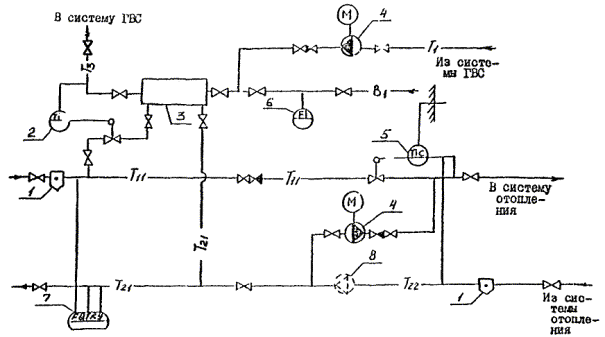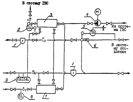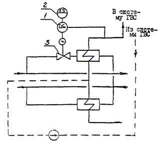 Рис. 3. Схема автоматизации МТП с зависимым присоединением систем отопления (насос на перемычке) и ГВС с параллельным присоединением водонагревателя: 1 - грязевик; 2 - регулятор температуры ГВ; 3 - водонагреватель ГВ; 4 - насос; 5 - регулятор отпуска теплоты на отопление; 6 - водомер; 7 - теплосчетчик; 8 - вариант насоса на обратном трубопроводе Рис. 4. Схема автоматизации МТП с зависимым присоединением систем отопления и ГВС со смешанным присоединением водонагревателей с ограничением расхода: 1 - грязевик; 2 - регулятор температуры ГВ; 3 - водонагреватель II ступени; 4 - насос; 5 - регулятор отпуска теплоты на отопление; 6 - водонагреватель I ступени; 7 - водомер; 8 - устройство ограничения расхода; 9 - теплосчетчик; 10 - вариант насоса на обратном трубопроводе Рис. 5. Схема автоматизации МТП с независимым присоединением системы отопления и ГВС со смешанным присоединением водонагревателей с ограничением расхода (1-7 - см. рис. 4): 8 - теплосчетчик; 9 - водонагреватель отопления; 10 - устройство ограничения расхода Рис. 6. Принципиальная схема автоматического регулирования температуры воды на ГВС с программным снижением: 1 - регулирующий прибор; 2 - программное реле времени; 3 - регулирующий клапан 22. Циркуляционные насосы типа ЦВЦ рекомендуется устанавливать на перемычке между подающим и обратным магистральными трубопроводами при движении воды в стояках сверху вниз (верхняя разводка) и на обратной магистрали - для остальных систем отопления. 23. Датчик температуры наружного воздуха (ТНВ) следует устанавливать на северном или северо-восточном фасаде здания на уровне не ниже 3 м от земли. Датчики ТНВ не следует располагать в нишах, углублениях стен и других местах с уменьшенной циркуляцией воздуха, а также над дверным и оконными проемами, около вентиляционных устройств вытяжной вентиляции и источников теплоты (холода). 24. В качестве датчика ТНВ рекомендуется использовать термопреобразователь сопротивления медный типа ТСМ-0879, помещенный в метеобудку, например, по черт. БАОМ 02000, разработанным ПКБ АКХ. 25. Датчики температуры внутреннего воздуха (ТВВ) рекомендуется устанавливать в сборных каналах вытяжной вентиляции из кухонь квартир (либо из кухонь и санузлов) на уровне последнего этажа здания путем подвешивания термопреобразователей на кабеле, заключенном в металлорукав, или в жилых комнатах контрольных квартир на внутренней стене у двери на высоте 1,5 м от пола. 26. Минимальное количество датчиков ТВВ при установке их в сборных каналах вытяжной вентиляции зданий высотой до 15 этажей должно быть: по 2 датчика на фасад - при пофасадном регулировании, 4 датчика (по 2 датчика на фасад) - без пофасадного разделения. Для зданий выше 15 этажей - по 2 датчика на фасад. 27. В качестве датчиков ТВВ используются термопреобразователи сопротивления медные ТСМ-8112, ТСМ-6114 и ТСМ-1079. Первый из указанных типов более предпочтителен. При применении датчиков ТСМ-6114 следует предусматривать горячую пайку проводов к клеммам датчика (к клеммам сначала подпаиваются тонкие провода, выводящие основной монтажный спай за пределы датчика). 28. При удалении датчиков от прибора до 100 м допускается прокладка линий связи без экранирования в защитных пластмассовых трубах; при удалении свыше 100 м - с экранированием (в металлорукаве или экранированным кабелем) и заземлением экрана. 29. При удалении от прибора
