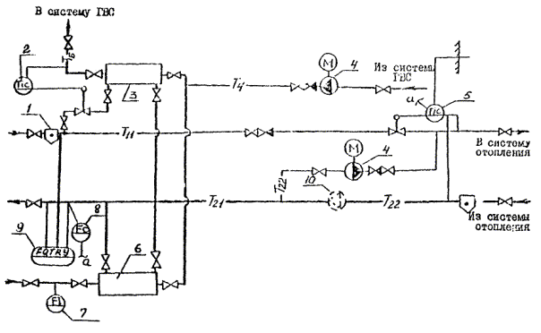 Схемы, основное оборудование и средства автоматизации ТП зданий13. При комплексной автоматизации систем теплоснабжения городов (районов) и поселков городского типа все МТП, присоединенные непосредственно к тепловой сети (без ГТП), следует оборудовать средствами автоматического регулирования отпуска тепловой энергии. Автоматизировать МТП, присоединенные к ГТП, следует при технико-экономическом обосновании. 14. Для зданий с расчетным расходом теплоты за отопительный период 1000 ГДж (240 Гкал) и более системы отопления следует оборудовать регулирующими приборами электронного типа [5], менее 1000 ГДж - допускается применять манометрические регуляторы. 15. При капитальном ремонте здания с полной заменой системы отопления или заменой разводящих и сборных магистралей, если расчетный расход теплоты за отопительный период на один фасад составляет 1000 ГДж и более, система отопления должна быть разделена на части с пофасадной ориентацией. Примечание. Рабочие проекты систем отопления с пофасадным автоматическим регулированием для капитального ремонта жилых домов ряда типовых серий разработаны ЦНИИЭП ИО. 16. Рекомендуемые схемы и приборы электронного типа для автоматизации систем отопления в зависимости от схем присоединения к тепловой сети водонагревателей горячего водоснабжения приведены в табл. 4. 17. Принципиальные схемы автоматизации систем отопления приведены в работах [5, 9, 10], а функциональные схемы - в работе [1]. 18. Принципиальные схемы автоматизации систем горячего водоснабжения приведены в работах [2, 9, 10], а функциональные схемы - в работе [1]. 19. Принципиальные схемы автоматизации МТП приведены на рис. 1-6, а примеры функциональных схем - в работе [1]. Примечание. На рис. 6-5 варианты с пофасадным делением систем отопления условно не показаны. Схемы пофасадного деления систем отопления приведены в работах [5, 9, 10], а функциональные схемы - в работе [1]. 20. Сохранение или исключение существующих или установка дополнительных регуляторов давления на обратном (регулятор «подпора») и на подающем трубопроводах определяется в зависимости от пьезометрических графиков тепловой сети. Места установки регуляторов показаны в материалах [1, 9, 10]. Рис. 1. Схема автоматизации МТП с элеваторным присоединением системы отопления и ГЭС со смешанным присоединением водонагревателей: 1 - грязевик; 2 - регулятор температуры ГВ; 3 - водонагреватель II ступени; 4 - насос; 5 - регулятор отпуска теплоты на отопление; 6 - элеватор с регулируемым сечением сопла; 7 - водонагреватель I ступени; 8 - водомер; 9 - теплосчетчик 21. При отсутствии теплосчетчика, имеющего в своем составе расходомер с унифицированным выходом (например, 0÷5 МА), устройство ограничения расхода (УОР) может быть выполнено на тепловом вводе на подающем трубопроводе тепловой сети перед присоединением водонагревателя горячего водоснабжения с помощью дифманометра (с измерительной диафрагмой), имеющего унифицированный или контактный выход.