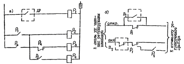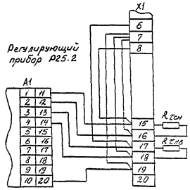 «трехпозиционный» ( Установите на магазинах сопротивлений значения 53 Ом для температуры наружного воздуха и 65,5 Ом для температуры смешанной воды. Включите тумблеры питания блока автоматики и регулирующего прибора. Проверьте правильность фазировки прибора. При увеличении сопротивления магазина температуры наружного воздуха должен включаться индикатор «Меньше», а при уменьшении - индикатор «Больше». Разность сопротивлений, при которой включаются (отключаются) индикаторы, должна быть не более 0,4 Ом. Добейтесь «Корректором» баланса прибора в положении, близком к среднему (значительное отклонение от середины свидетельствует о разрегулировке прибора). Установите потенциометр К2 в положение 0,625 и добейтесь «Корректором» баланса. Отключите тумблер питания регулируемого прибора и установите на магазинах сопротивлений значения 55,25 и 61,4 Ом согласно второй точке настройки (см. табл. 5) при температуре наружного воздуха 10 °С и включите тумблер питания. При этом выбор должен оставаться в балансе, что определяется по световым индикаторам. В случае включения одного из них необходимо изменением сопротивления магазина температуры наружного воздуха добиться погасания индикатора. Если при этом разность сопротивлений этого магазина в положении баланса прибора и в контрольной точке (55,23 Ом) меньше 0,2 Ом, то дополнительная регулировка К2 не требуется, и настройка закончена (величина 0,2 Ом соответствует изменению температуры наружного воздуха на 0,9 °С). Если указанная разность сопротивления больше 0,2 Ом, выставьте на магазинах сопротивлений первую контрольную точку (53 и 65,5 Ом), подкорректируйте положение потенциометра К2 (при положительной разности сопротивлений, т.е. больше 0,2 Ом, К2 необходимо уменьшить, при отрицательной разнести К2 необходимо увеличить) и добейтесь «Корректором» баланса. Затем снова установите на магазинах сопротивления, соответствующие второй точке, и определите разность сопротивлений. Если она меньше 0,2 Ом, то прибор настроен; если больше, повторите настройку до тех пор, пока не будет достигнут баланс прибора по двум точкам. Дополнительный контроль можно провести по промежуточной точке табл. 5 при 5 °С температуры воздуха аналогично выше описанному. Установите на субблоке Р-011 следующие значения параметров динамической настройки, соответствующие оптимальному процессу регулирования: «зона» - 0,5+0,8; «импульс» - 0,8+1; Кп - 5; Ти - 40÷50; «демпфер» - 4÷5. Отсоедините магазины сопротивлений; отсоедините перемычки от клеммы 7 и изолируйте отдельно каждый провод. Настройка закончена. Настройка блока автоматики в эксплуатационных условиях на объекте. Отсоедините датчик температуры наружного воздуха (клеммы 17, 18, 19) и датчик температуры смешанной воды (клеммы 15, 16 и 19). Подключите к клеммам 6, 7 и 8 эталонные резисторы согласно схеме рис. 9 (клеммы 6, 7 - 53 Ом и клеммы 8, 7 - 65,5 Ом). Замкните перемычкой, установленной в клеммнике, клеммы 7, 16, 18 и 19 блока автоматики и замкните контакт реле времени КТ1 поворотом программного диска. Проделайте подготовительные операции, описанные выше (стр. 35). Включите тумблеры питания блока автоматики и регулирующего прибора. Убедитесь, что прибор балансируется «корректором» в положении, близком к среднему. Установите потенциометр К2 в положении, соответствующее Δτ по табл. 6 для температурного графика данной сис