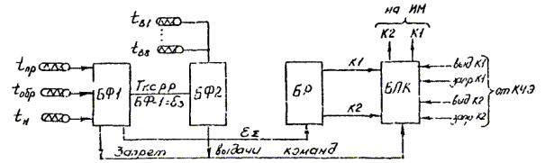 эксплуатации на объекте производить путем установки потенциометров Т, Обслуживание "Электроники – PIМ" состоит в ежедневном фиксировании значений температуры смешанной воды на отопление. В случае отклонения этой температуры от заданного графика (по касательной на рис. 11) больше чем на 2,5 °С следует произвести настройку, как при стендовой проверке. При выходе БЭУ из строя его необходимо выключить от сети с помощью тумблера, с помощью ручного управлении установить требуемую температуру смешанной воды и демонтировать БЭУ. Прибор регулирующий Т48М-2 Стендовая проверка. Подключить к регулирующему прибору Т48М-2 датчики (термопреобразователи сопротивления) и регулирующий клапан, программное реле времени (при необходимости), электропитание. Для проверки баланса регулятору задеть проверочный температурный график отпуска теплоты, для чего установить настроечными органами следующие параметры задания: tн = -10 °С, Кн = 1, ΔТ = tв + 10 °С (ΔТ вычисляется по температура воздуха tв, которая должна быть измерена техническим термометром в помещении, где проводится проверка). Порядок настройки следующий (см. структурную схему прибора на рис. 12): включить тумблер «Сеть», проконтролировать наличие напряжения по светодиоду «Сеть»; установить тумблер блока БПК в положение «Авт»; установить тумблер блока БФ1 в положение «Установка»; проконтролировать отключение датчиков по светодиоду; установить Кн = 4 поворотов по часовой стрелке до упора; установить ТΔ = 40 °С; добиться задатчиков tн баланса, который определяется по погасанию обоих светодиодов К1 и К2 на БПК; установить ΔТ = 10 °С, добиться задатчиком Кн баланса; установить ΔТ = tв + 10 °С [например, при tв = 20 °С ΔТ = (20 + 10) °С = 30 °С]; установить tв равной фактической температуре воздуха в помещении, где проводится проверка; установить Кв↓ и Кв↑ на нуль; установить задатчики динамической настройки на БР и ΔТ↕ на БФ1 на середину. Включить автоматический режим работы отключения тумблера «Установка» на БФ1. Прибор должен идти в положение баланса. Если длительное время баланс не устанавливается, подкорректировать ΔТ. Проверку правильности фазировки прибора осуществить изменением настроечных органов в большую и меньшую сторону от положения баланса. При этом уменьшение ΔТ, tн и увеличение Кн должны вызывать закрытие рабочего органа клапана (горит светодиод К1 на ГПК, т.е. больше нормы), а увеличение ΔТ, tн и уменьшение Кн вызывают открытие рабочего клапана (горит светодиод К2, т.е. меньше нормы). После определения правильности фазировки установить все задатчики в положение баланса. Если фазировка неверна, то переключить цепи регулируемого клапана. Если и после этого не удается правильно сфазировать или не удается установить прибор в положение баланса, то прибор Т48М-2 следует отбраковать. Рис. 12. Структурная схема регулирующего прибора Т48М-2: БФ1 - блок формирования графика отпуска теплоты; БФ2 - блок формирования температуры в помещениях; БР - блок регулирования; БПК - блок питания и коммутации; tпр, tобр - датчики температуры воды; tн - то же наружного воздуха, tВ1, ..., tВ8 - то же воздуха в помещениях. Проверку программного снижения осуществить путем замыкания вручную контакта реле времени при положении баланса. При этом рабочий орган должен идти на закрытие и светодиод К1 загорится (больше нормы). Проверку коррекция по темпера