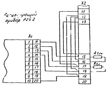 перемычку режима в положение б) с помощью ручного управления прибора добиться требуемой температуры горячей воды (60 °С) на выходе водонагревателя (смесительного устройства); в) установить органы α1 и α2 в крайнее левое положение и с помощью корректора добиться баланса усилителя рассогласования (светодиоды не горят); г) установить перемычку режима работы прибора в положение ПИ; д) установить зону нечувствительности Δ, коэффициент передачи αп, время интегрирования τи, время демпфирования τдф. Зону нечувствительности выбрать равной половине допустимого отклонения регулируемой температуры, но не меньше Δ > tИ / αП, где tИ - длительность интегральных импульсов для исключения автоколебаний. Время τдф принимается равным 1-2 с. Пуск регулятора в работу произвести путем перевода его в автоматический режим. В процессе эксплуатации наблюдают за точностью поддержания заданной температуры воды и правильностью выбора динамических параметров, обеспечивающие удовлетворительное протекание переходных процессов: максимально возможное быстродействие при минимальном числе включения регулятора. Блок автоматики регулятора ЭРСА Настройка на заданный график при стендовой проверке и настройка в условиях эксплуатации на объекте отличаются элементами, подключаемыми на входы регулирующего прибора Р25.2, и количеством точек настройки. При стендовой проверке на входы Р25.2 подключаются два магазина сопротивлений в соответствии со схемой рис. 8. В эксплуатационных условиях на входы прибора подключаются два эталонных резистора из комплекта элеватора сопротивлением 53 и 65,5 Ом в соответствии со схемой рис. 9. Настройка блока автоматики при стендовой проверке осуществляется по следующим параметрам: температура смешанной воды τсм при температуре наружного воздуха 0 °С (τ0°), разности Δτ = τ0° - τ10° (где τ10° - температура смешанной воды при температуре 10 °С наружного воздуха) и Δτночн - снижению температуры смешанной воды при отпуска теплоты в ночное время. Рис. 8. Схема электрическая подключений магазинов сопротивления Значение τсм устанавливается потенциометром «Задание» прибора, значение Δτ - потенциометром К2 прибора, значение Δτночн - потенциометром R2 блока автоматики. Контрольные точки настройки определены в табл. 5. Рис. 9. Схема электрическая подключений эталонных резисторов Таблица 5 Значения контрольных точек настройки