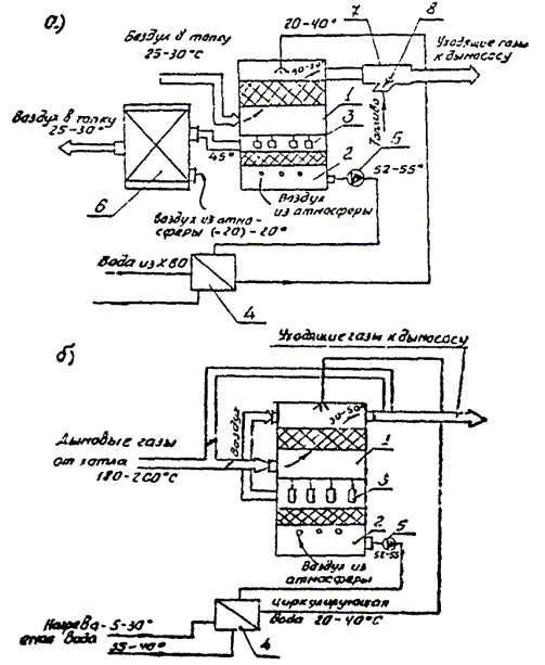 Недостатком использования контактных теплообменников является наличие подогретой орошающей воды, насыщенной углекислотой, нагрев воздуха в отдельном контактном воздухоподогревателе к подаче сильно увлажненного воздуха в топку котла, что приводит к снижению температуры дымовых газов в топке и снижению производительности котла. Для устранения этих недостатков предложены схемы утилизации теплоты, в которые включены контактные подогреватели со встроенными декарбонизаторами. Принципиальная схема утилизации теплоты дымовых газов, с применением поверхностного воздухоподогревателя представлена на рис. 7, а. Охлаждающая вода подается сверху в контактный теплообменник навстречу восходящему потоку газов. Нагреваясь, вода поступает в декарбонизатор 2 через гидрозатворы 3. В декарбонизаторе вода продувается воздухом и подастся в теплообменник 4, где нагревает сырую или химическую очищенную воду, затем снова по замкнутому контуру направляется в контактный теплообменник. Воздух в декарбонизаторе 2 нагревается, увлажняется и подается в поверхностный воздухоподогреватель, где за счет конденсации паров нагревает воздух, поступающий на атмосферы, при этом сам осушается. После смещения оба потока воздуха подаются в топку котла. Подобная установка имеет сменное аппаратурное оформление и ее использование целесообразно с целью увеличения тепловой мощности котельной. В этом случае необходимо использовать весь объем газов, а для предотвращения конденсации водяных паров следует смешивать их с высокотемпературными дымовыми газами, образованными при сжигании дополнительного количества топлива. Для этой цели перед дымососом предусмотрена смесительная камера 7 в дымоходе с патрубком, в котором расположены горелки 8, благодаря которым осуществляется подогрев уходящих газов за 25-50 ºС. В том случае, когда утилизация теплоты дымовых газов имеет целью снижение расхода топлива, может быть использована установка, принципиальная схема которой приведена на рис. 7, б. Увлажненный воздух засасывается из декарбонизатора в контактный теплообменник и выбрасывается вместе с дымовыми газами через дымовую трубу в атмосферу, а для предотвращения конденсации водяных паров производится байпасирование дымовых газов. Рис. 7. Схема утилизации теплоты дымовых газов котла КВГМ-180: а - утилизация с воздухоподогревателем; б - утилизация с обводным газоходом; 1 - контактный подогреватель циркулирующей воды; 2 - декарбонизатор; 3 - гидрозатворы; 4 - теплообменник; 5 - насос; 6 - воздухоподогреватель; 7 - смесительный газоход; 8 - горелка Имеются разработки контактно-декарбонизационного экономайзера пропускной способностью по дымовым газам 70-85 и 140-165 тыс. нм3/ч. Для котлов теплопроизводительностью свыше 100 Гкал/ч конструкции теплоутилизаторов дымовых газов находятся на стадии опытных разработок и дальнейшее развитие могут получить только при стимулировании за экономию топливно-экономических ресурсов. При всей привлекательности использования контактных теплообменников при утилизации теплоты уходящих газов котлов основной недостаток установок - поглощение водой из продуктов сгорания углекислоты и кислорода и приобретение ею таким образом коррозионно-агрессивных свойств - сдерживает широкое применение таких теплообменников. Для нормальной работы устан