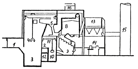 1 - разгрузочная площадка мусоровозов; 2 - площадка для транспорта вывоза остатков; 3 - приемный бункер; 4 - мостовой кран с грейферным ковшом; 5 - приемная воронка котла с течкой; 6 - питатель; 7 - валковая колосниковая решетка; 8 - парогенератор; 9 - система шлакозолоудаления; 10 - бункер шлака и золы; 11 - кран для погрузки шлакозолоотходов; 12 - помещение баков охлаждающей воды и отстоя; 13 - электростатический фильтр; 14 - турбогенератор; 15 - дымовая труба; 16 - воздушный конденсатор