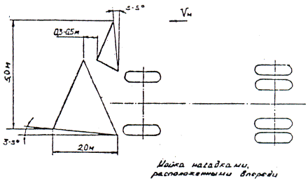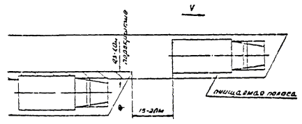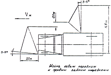 7. Работу подметально-уборочных машин при уборке площадей перед рынками, вокзалами, стадионами рекомендуется производить колонной машин, движущихся уступом на расстоянии 10 - 20 м. При этом должно быть обеспечено перекрытие подметаемых каждой машиной полос на величину около 0,5 м. 8. Подметание дорожных покрытий должно производиться только при увлажнении дорожных покрытий, на всей ширине полосы захвата. При уборке загрязнений, имеющих значительные колебания по уровню накопления, рекомендуется корректировать в необходимых пределах расход воды через увлажняющие сопла. 10. При подметании дорог на улицах, у которых прилотковая полоса занята стоящими автомобилями, следует согласовать с местными органами ГАИ о размещении их попеременно через день только у одной стороны улицы. Мойка и поливка 11. Мойку проезжей части производят на улицах, имеющих приемные колодцы дождевой канализации. На дорогах, имеющих продольные уклоны для обеспечения хорошего качества уборки, мойку следует вести под уклон. Во время мойки положение машины и моечных насадков должно исключать возможность попадания смытых загрязнений и струй воды на тротуары и полосы зеленых насаждений. 12. Проезжую часть дорог моют в ночное время при наименьшей интенсивности движения транспорта. Мойка в дневное время допустима только непосредственно после дождя, когда загрязнение городских дорог резко увеличивается, так как дождевая вода смывает грунт с газонов, площадок и т.д. В отличие от механизированного подметания, которое производится только в сухую погоду, мойка в дождливые периоды, если дождь не носит ливневого характера, применяется в месте подметания в качестве единственной операции по уборке загрязнений. 13. Мойка проездов шириной до 15 м выполняется одной машиной за два прохода. При мойке улиц шириной свыше 15 м используется колонна поливочно-моечных машин. Первая, головная машина захватывает при мойке часть осевой полосы, а остальные двигаются уступом на расстоянии между машинами 15 - 20 м. Полоса, вымытая впереди расположенной машиной, должна перекрываться следующей за ней машиной на 0,5 - 1 м. Мойка проездов с односторонним движением производится в сторону по направлению к лотковой полосе, имеющей колодцы дождевой канализации. 14. при отсутствии необходимого количества подметально-уборочных машин на улицах, имеющих продольный уклон более 0,5 % и дождевую канализацию, рекомендуется производить уборку загрязнений путем мойки лотков. Для обеспечения высокого качества мойки прилотковой полосы дорожное покрытие должно отвечать следующим требованиям: поперечный профиль дороги должен соответствовать существующим нормам; засоренность не должна превышать 200 г/м2. 15. Мойка прилотковой полосы производится специальным насадком. При отсутствии специального насадка для мойки полосы насадок может быть изготовлен из имеющегося на машине обычного насадка путем замены прокладки*. Положение насадка относительно машины и дорожного покрытия во время мойки прилотковой полосы приведено на рис. 5. Для обеспечения требуемого положения насадок должен быть повернут относительно своей продольной оси, чтобы левая кромка насадка была бы выше правой. * См. разд. III, п. 6 - 9 настоящих Рекомендаций. 16. В процессе мойки необходимо контролировать положение насадка и струи с тем, чтобы не допуска