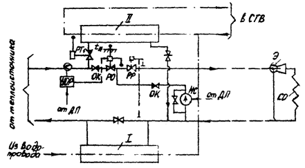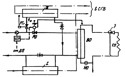 водоснабжение в ЦТП (с типичным для района отношением нагрузок rт = ( 11. Построение отопительного и повышенного температурного графика производится по известной методике [1, 3, 7]. Величины регулируемых давлений определяются гидравлическим расчетом сети и условиями присоединения потребителей к сети и рельефом местности. При этом давление в обратном трубопроводе котельной должно быть таким, чтобы при полном прекращении подачи теплоносителя системам отопления и на водонагреватели верхней ступени регуляторами в ЦТП обеспечивался требуемый для каждого из присоединенных зданий напор в обратном трубопроводе отопления на выходе каждого ЦТП (во избежание оголения систем отопления зданий). 13. Регулирование температуры подающей сетевой воды на выходе котельной производится автоматическим регулятором температуры или дистанционными средствами управления из диспетчерского пункта котельной по прибору, измеряющему температуру наружного воздуха, путем воздействия на подачу топлива в котлы и регулирующий орган на узле подмешивания сетевой годы. Постоянство давления воды в обратном трубопроводе до сетевых насосов поддерживается автоматическим регулятором давления (регулятором подпитки сети). Технологические схемы и схемы автоматизации ЦТП 15. Для ЦТП жилых микрорайонов основной схемой присоединения водонагревателя горячего водоснабжения при отсутствии бака-аккумулятора является смешанная с ограничением расхода воды схема (рис. 1, 2) [4, 5]. Для ЦТП при наличии бака-аккумулятора присоединение водонагревателя горячего водоснабжения осуществляется по смешанной схеме (см. рис. 1, 2 без элементов УОР с включением НС по импульсу tн) [4, 5]. Рис. 1. Технологическая схема ЦТП со смешанной схемой присоединения водонагревателя горячего водоснабжения, автоматическим регулированием отпуска теплоты и зависимым присоединением систем отопления: I, II - ступени водонагревателя горячего водоснабжения; ОК - обратный клапан; НС - насосы смешения; Э - элеватор с ручным регулированием (иглой); СО - система отопления; СГВ - система горячего водоснабжения; ДП - диспетчерский пункт. Остальные обозначения см. в тексте Рис. 2. Технологическая схема ЦТП со смешанной схемой присоединения водонагревателя горячего водоснабжения, автоматическим регулированием отпуска теплоты и независимым присоединением систем отопления: НО - насос отопления; ВО - водонагреватель отопления. Остальные обозначения см. в тексте и на рис. 1 при отсутствии устройств ограничения расхода - смешанная схема без регулятора расхода воды (с частичным ограничением расхода) (см. рис. 1, 2 без элементов УОР и РР, но с включением НС по импульсу tн) [4]; при ограниченной пропускной способности подводящих тепловых сетей и отсутствии устройств ограничения расхода - двухступенчатая последовательная схема (с переключением ее на смешанную по импульсу tн) [4]. 17. Независимо от схемы водонагревателя горячего водоснабжения ЦТП с зависимым присоединением систем отопления зданий оборудуется корректирующими насосами смешения для систем отопления. 18. Схемы автоматизации регулирования отпуска теплоты в ЦТП включают (см. рис. 1, 2): автоматический регулятор температуры воды на отопление в зависимости от температуры наружного воздуха (РО); автоматический регулятор температуры воды на горячее водоснабжение (РТг); а