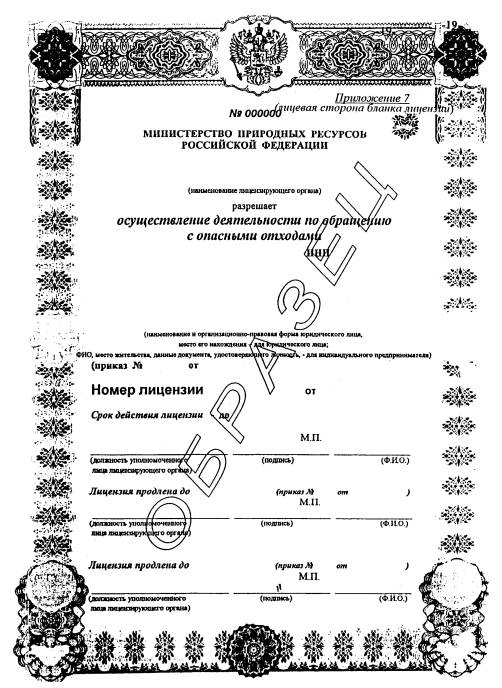 _____________________________ * Не считать подпадающими под лицензирование вида деятельности по обращению с опасными отходами работы по сбору и хранению собственных отходов индивидуальными предпринимателями и юридическими лицами непроизводственной сферы, разработавших и утвердивших в установленном порядке проект нормативов образования отходов и лимитов на их размещение по упрощенной схеме (см. приказ МПР России от 11.03.2002 г. N 115). ** Дубликат лицензии оформляется на ксерокопии документа, подтверждающего наличие лицензии, заверяется печатью лицензирующего органа, в правом верхнем углу дубликата лицензии ставится штамп "ДУБЛИКАТ". Сведения о выданных лицензиату дубликатах лицензии заносятся в реестр лицензий. *** Перечисление в федеральный бюджет лицензионных сборов осуществляется соискателем лицензии (далее - СЛ) через банк, реквизиты которого СЛ узнает в налоговой инспекции, в которой СЛ состоит на учете, название сбора - "Прочие лицензионные и регистрационные сборы", НДС не облагаются.
