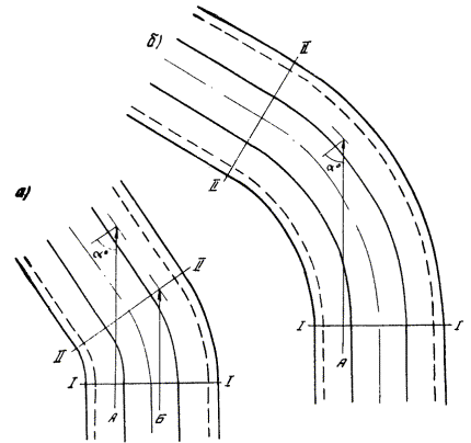 Найденные расчетные параметры волн hicr,u, 4.14. Пример расчета параметров волн, воздействующих на откосы каналов на прямолинейных участках, дан в приложении 4. 5. ОПРЕДЕЛЕНИЕ ПАРАМЕТРОВ ВОЛН, ВОЗДЕЙСТВУЮЩИХ НА ОТКОСЫ КАНАЛОВ НА ПОВОРОТАХ5.1. Выпуклую сторону откосов каналов на повороте крепят так же, как примыкающий к ней прямолинейный участок. 5.2. Рефракцию волн на вогнутой стороне откоса канала при повороте рассчитывают по лучу А (рис. 2), идущему по глубине dк от прямолинейной расчетной части канала с внутренней, выпуклой стороны поворота до пересечения с изобатой на той же глубине на прямолинейной части канала за поворотом (рис. 2, а) или на вогнутой стороне поворота (рис. 2, б). 5.3. Расчет рефракции волн на криволинейной части откоса канала в принципе не отличается от расчета рефракции волн на прямолинейной части канала (см. раздел 4). Однако в этом случае необходимо вычерчивание планов рефракции, так как из-за криволинейности изобат луч подходит к последующей к-й изобате не под углом aк = aк-1 = Daк, как в случае прямолинейных изобат, а с добавлением к Daк поправки на поворот к-й изобаты относительно (к - 1)-й. Поэтому угол подхода волнового луча к последующей изобате снимают с плана рефракции, на который наносят последовательно (поэтапно) траекторию луча. 5.4. Угол a1 между рассматриваемым лучом и нормалью к донной изобате откоса a1 = 90° - b (19) и вводить дополнительную исходную глубину d¢1, не требуется, т.е. d1 = dк. (20) 5.5. Если часть фронта исходной волны или весь фронт этих волн выходит на прямолинейную часть канала за часть канала за поворотом, то рассчитывают траекторию по разделу 4 настоящих Методических рекомендаций с учетом равенств (19) и (20). 5.6. Для избежания графических построений планов рефракции расчет рефракции волн на криволинейных изобатах допускается проводить по п. 5.5. Угол a1 при этом снимают с плана поворота канала. Рефракция волн на прямолинейных изобатах несколько меньше, чем на криволинейных, что ведет к увеличению высоты расчетной волны. Однако увеличение это незначительное и не превышает 10 %. 5.7. Параметры волн на траектории луча рассчитывают по разделу 4 настоящих Методических рекомендаций. 5.8. Пример расчета параметров волн, воздействующих на откосы каналов на поворотах, дан в приложении 4. 6. ОПРЕДЕЛЕНИЕ МАКСИМАЛЬНЫХ (ПРЕДЕЛЬНЫХ) ПАРАМЕТРОВ ВЕТРОВЫХ ВОЛН В КАНАЛАХ ПРИБЛИЖЕННЫМ МЕТОДОМ6.1. Метод основан на следующих положениях [12]: глубина воды dк - ограничена; скорость ветра - максимально возможная; разгон - неограничен. Следовательно, параметры волн определяются параметрами самого канала. 6.2. При максимальном ветре и неограниченном разгоне, но ограниченной глубине, длина ветровой волны, согласно наблюдениям, не может превышать двойной глубины воды, т.е. lmax = 2dк. (21) 6.3. Согласно экспериментальным данным, полученным в гидравлических лабораториях при различных волновых режимах, установлено, что наибольшая крутизна для устойчивой системы волн составляет: 6.4. Из выражений (21) и (22) получено соотношение для определения высоты волны hmax = 0,2dк. (23) 6.5. Период волны предлагается определять по формуле 6.6. Максимальной высоте волны, получаемой при статистической обработке натурных наблюдений, рекомендуется придавать обеспеченность в системе 0,1 %. 6.7. Высоты волн любой другой обеспеченности в системе рекомендуется определять по рис. 2 приложения 1 [1]. 6