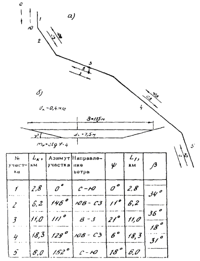На рис. 2 и 3 представлены схемы, поясняющие выбор параметров волн и размещение зон воздействия этих параметров. Как видно из рис. 2 специальное крепление поворотов необходимо только в двух случаях: на 1-й части поворота 2-3 и 2-й части поворота 4-5, где параметры волн существенно отличны от воздействующих на прямолинейные участки.