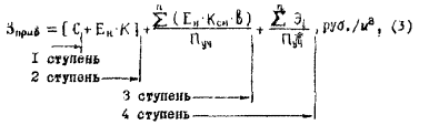 где Ксм - удельные капиталовложения в смежные отрасли промышленности, руб./продукции; в - годовая потребность в материалах, выпускаемых смежной отраслью, ед. продукции; Пуч - годовая производительность участка (установки), м3; Эi - годовой экономический эффект от производства и использования единицы продукции участка в i-й сфере потребления, руб. 2.12. Сопоставляются следующие решения: а) вся себестоимость изделия (1 ступень сравнения); б) доля себестоимости изделий, непосредственно связанная с тепловой обработкой (1 упрощенная ступень сравнения); в) сумма себестоимости изделия с нормативной эффективностью капиталовложений (2 ступень сравнения); г) себестоимость изделия, нормативная эффективность капиталовложений в сумме с нормативной эффективностью капиталовложений в смежные отрасли промышленности, поставляющие материалы или оборудование (3 ступень сравнения); д) все предыдущие ступени в сумме плюс дополнительные затраты или экономия в народном хозяйстве от повышения качества изделий (4 ступень сравнения). 2.13. При полном расчете себестоимости изделий предлагается использовать следующую развернутую формулу приведенных затрат с включением всех четырех ступеней сравнения: