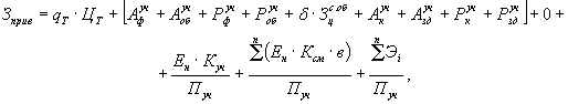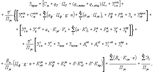 где Зпрям - прямые затраты, руб./м3; Зкосв - косвенные затраты, руб./м3; η′ - доля косвенных затрат, относящихся к сравниваемой установке; η″ - доля общезаводских расходов, относящихся к сравниваемой установке; Зз - общезаводские расходы, руб.; Куч - капиталовложения, относящиеся к сравниваемому участку, руб. 2.14. Расчетная формула приведенных затрат в развернутом расшифровкой виде: где См - стоимость основных и вспомогательных материалов, руб./м3; qТ - удельный расход тепловой энергии, затрачиваемой на технологические нужды, тыс. ккал/м3; ЦТ - прейскурантная цена энергии, затрачиваемой на технологические нужды, руб./тыс. ккал; qэ.тепл - удельный расход электрической энергии на тепловую обработку, кВт·ч/м3; qэ.общ - удельный расход электрической энергии, затрачиваемой на все остальные общезаводские нужды, кВт·ч/м3; Цэ - прейскурантная цена электрической энергии руб/кВт·ч; Зоснз.п - основная заработная плата производственных рабочих цеха с начислениями, руб./м3; Звспз.п - заработная плата вспомогательных рабочих по цеху, руб.; Свспм - стоимость вспомогательных материалов по цеху, руб.; аф, аоб - коэффициенты к нормам амортизации для учета средних и текущих ремонтов, технического ухода для форм и оборудования; Цф - стоимость 1 т форм данного вида, руб./т; g - масса одной формы данного вида, т; n - количество форм данного вида, шт.; Цоб - стоимость производственного оборудования и транспорта цеха, руб.; Pцф, Рцоб - стоимость текущего ремонта соответственно форм и производственного оборудования, транспорта цеха, руб.; Зи - стоимость возмещения износа малоценного и быстроизнашивающегося инвентаря, руб.; Зпрочоб - прочие расходы, руб.; Зцз.п - заработная плата цехового персонала с начислениями, руб.; Зс.здц - стоимость содержания зданий и сооружений (в том числе отопление, вентиляция, освещение), руб.; ак - коэффициент к нормам амортизации камер и тепловой обработки на сравниваемом участке или технологической линии; Куд - удельные капиталовложения в камеру тепловой обработки, руб./м3; Vк - объем камер, м3; аi - коэффициент амортизации i-го здания; Кi - удельные капиталовложения в i-е здание, руб./м3; Рцк - затраты на текущий ремонт камер тепловой обработки цеха, руб.; Рцзд - то же, зданий и сооружений цеха, руб.; Зоц - расходы по охране труда и противопожарной технике цеха, руб.; Зпрц - прочие расходы цеха, руб.; Ззз.п - заработная плата работников заводоуправления с начислениями, руб.; Зоз - затраты на охрану труда и противопожарную технику по заводу, руб.; Зком - командировочные расходы, руб., Зпочт - почтово-телеграфные расходы, руб.; Аобз - амортизационные отчисления на оборудование общезаводских служб, руб.; Аздз - амортизационные отчисления на общезаводские здания и сооружения, руб.; Зс.обз - затраты на содержание оборудования общезаводских служб, руб.; Зпрз - прочие общезаводские расходы, руб.; Кучоб - капиталовложения в оборудование участка, руб.; Кучф - капиталовложения в формы участка, руб.; Кучк - капиталовложения в камеры участка, руб.; δ′ - доля капиталовложений в здание цеха, системы вентиляции и отопления, необходимых для функционирования сравниваемого участка; δ″ - доля дополнительных капиталовложений в сооружения завода, необходимых для функционирования сравниваемого участка; Кцзд - стоимость зданий и сооружений цеха, руб.; Кпр - прочие дополнительные капиталовложения в соо