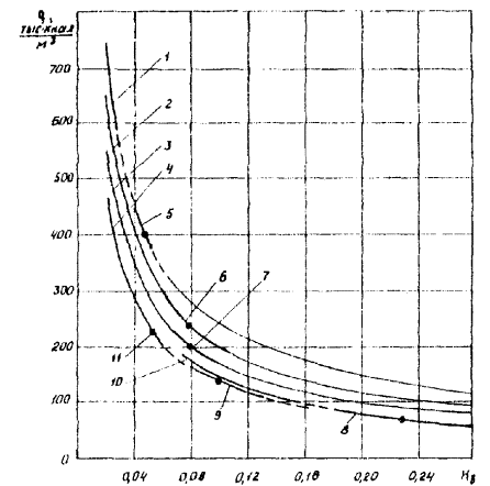 Зависимость удельного расхода тепла q от коэффициента загрузки пропарочных камер при различных модулях поверхности камер, [14] а) для всех видов изделий в зависимости от величины Мп камер 1 - Мп = 2,8 - 3,5; (q = 46 · Кз-0,708); 2 - Мп = 2,06 - 2,7; (q = 35,4 · Кз-0,745); 3 - Мп = 1,76 - 2,05; (q = 32 · Кз-0,716); 4 - Мп = 1,1 - 1,75; (q = 22,5 · Кз-0,785); б) для конкретных видов изделий 5 - фермы; 6 - колонны; 7 - фундаменты, подушки; 8 - пустотный настил; 9 - сплошные плиты; 10 - изделия КПД; 11 - ребристые плиты Приложение 2ДВУХСТАВОЧНЫЕ ТАРИФЫ НА ЭЛЕКТРОЭНЕРГИЮ, [7]Двухставочный тариф состоит из основной и дополнительной ставки. Основная ставка предусматривает годовую плату в рублях и копейках за один киловатт (кВт) заявленной потребителем мощности участвующей в максимуме энергосистемы. По этой тарифной ставке взимается плата с промышленных и приравненных к ним предприятий с годовым максимумом не ниже 500 кВт. Под заявленной мощностью имеется в виду наибольшая получасовая мощность в кВт, отпускаемая потребителям в часы суточного максимума нагрузки энергосистемы. Заявленная мощность фиксируется (по кварталам) в договоре и периодически контролируется энергоснабжающей организацией по показаниям приборов учета определяющей нагрузки потребителей в часы максимума нагрузки энергосистемы. Часы максимума нагрузки энергосистемы устанавливаются энергоснабжающей организацией по кварталам в соответствии с режимом нагрузки энергосистемы и фиксируются в договоре с потребителем. Сумма основной годовой платы также устанавливается в договоре по кварталам, исходя из зафиксированной в договоре нагрузки потребителей по кварталам. Основная плата за киловольт-ампер (кВ · А) оплачиваемой присоединенной мощности применяется к потребителям с максимумом нагрузки: а) менее 500 кВт и присоединенной оплачиваемой мощности не ниже 100 кВ · А; б) менее 500 кВт, не имеющим приборов учета максимума нагрузки до установки необходимых измерительных приборов. Дополнительная ставка двухставочного тарифа предусматривает плату за киловатт-часы (кВт · ч) активной электроэнергии, учтенной счетчиком. Энергосистемы, которые по состоянию своего топливно-энергетического баланса и водных ресурсов, а также в целях использования мощностей в часы минимальных нагрузок, заинтересованы в повышении внепикового, главным образом, ночного электропотребления, имеют право (по разрешению Министерства энергетики и электрификации СССР) дифференцировать указанные в прейскуранте тарифы по периодам (зонам) суток (наибольшие тарифы в пиковые часы, наименьшие - в ночные часы). Промышленные и приравненные к ним потребители, рассчитывающиеся за электроэнергию по двухставочному тарифу, получают скидки или выплачивают надбавки к тарифу как с основной, так и дополнительной платы по прилагаемой шкале скидок и надбавок за косинус φ. Таблица 1 Шкала скидок с тарифа на электроэнергию и надбавок к тарифу на электроэнергию за коэффициент мощности электроустановок (косинус φ)