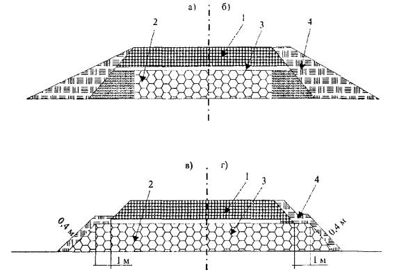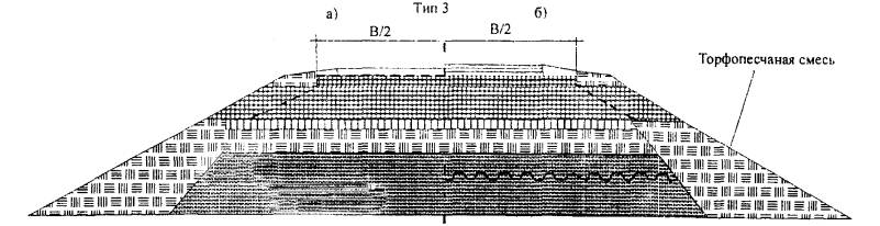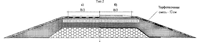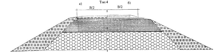 Примечания: 1. Конструкция может быть применена и для насыпи < 1,5 м при внесении необходимых коррективов в конструкцию нежесткой дорожной одежды. 2. Пунктир на откосах - граница слоя торфа (торфопесчаной смеси). 3. Типы теплоизоляции откосов в конструкциях «а» и «б» взаимозаменяемы. 4. Глубина заложения паронепроницаемой прослойки определяется специальным расчетом с учетом толщины ядра из МКГ. Рис. 4. Дорожные конструкции из мерзло-комковатого грунта при высоте насыпи 21,5 м (с вариантом теплоизоляции «б» рис. 1)