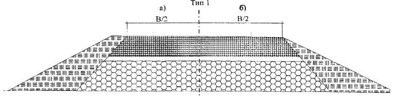 Примечание. Возможен вариант без гидроизоляции. Рис. 5. Дорожные конструкции из мерзло-комковатого грунта при высоте насыпи > 3,5 м (с вариантами теплоизоляции откосов «а» и «б» рис. 1) Расчеты на прочность рекомендуется проводить по ВСН 46-83 для дороги III технической категории с расчетной интенсивностью движения расчетных автомобилей, равной 100 авт./сут при требуемой надежности 0,94. 5.2.11. Для повышения надежности конструкции и снижения (при условии обеспеченной термоустойчивости) толщин отдельных конструктивных слоев в конструкции может быть предусмотрено устройство несущего слоя на основе объемных георешеток. В этом случае корректировка конструкции осуществляется по специальной методике. 5.3. Требования к материалам, применяемым в конструктивных элементах насыпей с использованием мерзло-комковатых грунтов 5.3.1. Верхняя часть насыпи (над теплоизолирующей прослойкой) должна устанавливаться только из сыпучемерзлого песчаного грунта, позволяющего получить требуемую действующими нормами степень уплотнения (ВСН 84-89). Таблица 1 Расчетные параметры материалов