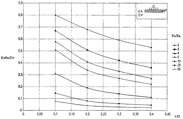 6.2. Особенности расчета на прочность 6.2.1. Проверка на прочность конструкции дорожной одежды с теплоизолирующим слоем над мерзло-комковатым ядром производится в соответствии с расчетами, предусмотренными ВСН 46-83 (для нежестких дорожных одежд) и ВСН 197-91 (для жестких дорожных одежд). Учет влияния теплоизолирующего слоя на прочность конструкции дорожной одежды осуществляется путем приведения системы «подстилающий грунт + теплоизолирующий слой» к однородному слою с расчетным модулем упругости, равным общему модулю упругости на поверхности теплоизолирующего слоя (ЕТобщ). Последний вычисляют по формуле где Ег - модуль упругости мерзло-комковатого грунта, подстилающего теплоизолирующий слой, МПа; Еп - модуль упругости плит теплоизолирующего слоя, МПа; Dо - расчетный диаметр отпечатка колеса, см; hn - толщина теплоизолирующего слоя, см. Практическое определение величины расчетного модуля ЕТобщ осуществляют с помощью номограммы (рис. 6.2.1), построенной по зависимости (6.2.1). 6.2.2. При конструировании дорожных одежд со слоями из пенополистирольных плит следует учитывать, что, исходя из технологических особенностей их устройства, над ними должен быть устроен защитный слой из дискретного материала, предохраняющий его от воздействия построечной техники, а под ними - выравнивающий слой толщиной 5 - 10 см. Защитный слой необходимо устраивать из дренирующего материала. 6.2.3. Если между подстилающим мерзло-комковатым грунтом и слоем из теплоизолирующих плит имеется прослойка песчаного грунта (дренирующий слой) толщиной более 5 см, в выражение (6.2.1) вместо Ег подставляется общий модуль на поверхности песчаной прослойки, определяемый по обычной методике. При меньшей толщине песчаной прослойки допускается не учитывать ее влияния в расчете. 6.2.4. При применении в конструкции дорожной одежды теплоизоляционного слоя следует выполнить проверку этого слоя на прочность при одноосном сжатии. Проверка ведется по двум расчетным случаям: - для условий эксплуатации дороги; - для условий строительства дорожной одежды. Проверка выполняется по зависимости Zт ³ ZТдоп, (6.2.2) где Zт - глубина расположения теплоизолирующего слоя от поверхности, к которой прилагается внешняя нагрузка (поверхность покрытия для условий эксплуатации или поверхность слоя засыпки при строительстве); ZТдоп - допустимая глубина расположения теплоизолирующего слоя от поверхности по условию прочности этого слоя на одноосное сжатие. Приближенно величину ZТдоп устанавливают по формуле где D - расчетный диаметр отпечатка колеса расчетной нагрузки, м; Р - давление от расчетного колеса на поверхность покрытия или слоя засыпки, МПа; R - прочность теплоизолирующих плит на одноосное сжатие при многократном нагружении, МПа; к - коэффициент запаса, принимаемый равным 1,3. В случае, если Zт < ZТдоп, нагрузка на глубине расположения теплоизолирующего слоя окажется больше его прочности. Тогда следует увеличить глубину расположения слоя. 6.2.5. При расчете на условия эксплуатации в качестве расчетной нагрузки принимается нагрузка, на которую рассчитывается вся дорожная конструкция. При расчете на условия строительства параметры нагрузки выбираются в зависимости от применяемой техники и технологии устройства слоев, располагаемых над теплоизолирующим слоем. Рис. 6.2.1. Номограмма для расчета общего модуля Е