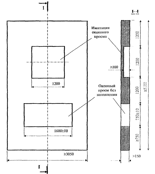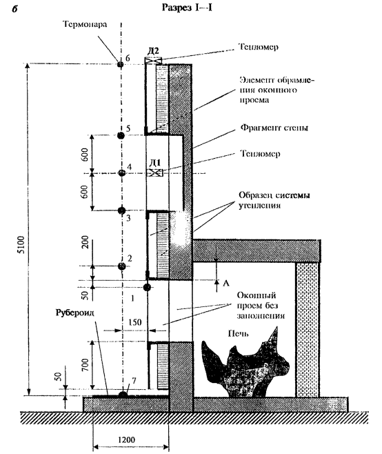 Рисунок 2 - Схема установки с образцом системы утепления 5.7 Приспособления для крепления фрагмента стены на печи должны обеспечивать его плотное примыкание к открытому проему печи и неизменяемость его расположения относительно печи в процессе испытания. 5.8 Перед фрагментом стены на основании из негорючих материалов, кроме металлов, вплотную к фрагменту стены и вдоль всей его ширины следует расположить лист рубероида марки РПЭ 300 или РПП 300 (по ГОСТ 10923) шириной не менее 1,2 м. 5.10 Требования к системам измерения 5.10.1 В процессе испытаний следует измерять и регистрировать параметры следующих характеристик: - плотность поглощенного теплового потока в точках, указанных на рисунке 2а и б; - температуры в факеле пламени из оконного проема фрагмента стены; - температуры на поверхности и внутри образца. Обязательные места установки датчиков для измерения параметров показаны на рисунке 2а и б. 5.10.2 Требования к термоэлектрическим преобразователям (далее - термопарам) для измерения температуры - по ГОСТ 30247.0. 5.10.3 Для измерения тепловых потоков следует использовать неселективные датчики поглощенного теплового потока (далее - тепломеры) с точностью измерения не менее 20 %, имеющие свидетельство о поверке, выданное уполномоченной на это организацией. Плоскости приемных поверхностей тепломеров Д1 и Д2 должны совпадать с плоскостью наружной поверхности образца. 5.10.4 Требования к приборам для регистрации измеряемых характеристик - по ГОСТ 30247.0. Периодичность регистрации показаний тепломеров не должна превышать 10 с. 5.10.5 Способы и приспособления для крепления тепломеров и термопар не должны влиять на их показания. 6 Образцы для испытаний6.1 Испытанию подлежат два образца. Возможность испытания одного образца устанавливается испытательной лабораторией на основании положений 10.2 ГОСТ 30403. 6.2 Для установления класса пожарной опасности системы утепления или отделки образец монтируется на фрагменте стены, соответствующем требованиям 5.2 и 5.3, в полном соответствии с технической документацией на испытываемую систему или отделку, в том числе и на конструктивное обрамление оконного проема. 6.3 В случае когда систему утепления или отделку предполагают использовать для применения на стене, не соответствующей 4.4, их образец следует монтировать на фрагменте стены конкретной конструкции с учетом 5.6, выполненном в полном соответствии с технической документацией на данную стену. В этом случае оценка класса пожарной опасности (по разделу 10) может быть отнесена как к стене вместе с системой утепления или отделкой, так и отдельно к системе утепления или к отделке на данной стене. 6.4 У образцов систем утепления и отделки без воздушного зазора со стеной нижний торец и центральная часть верхнего торца шириной не менее 0,5 м не должны иметь наружного защитного слоя. Горизонтальные торцы образцов вентилируемых систем утепления и отделки должны быть открытыми, а вертикальные торцы - закрытыми. 6.5 Влажность образцов - по ГОСТ 30247.0. 6.6 Монтаж образца испытываемой системы утепления или отделки на фрагменте стены, а также изготовление фрагмента стены, не соответствующей 4.4, выполняются заказчиком испытания. 6.7 При использовании в конструкции горючих (по ГОСТ 30244) материалов следует производить в процессе изготовления образцов для испытаний отбор проб этих материалов для