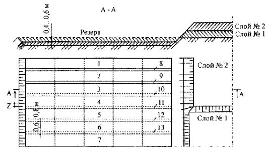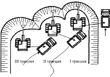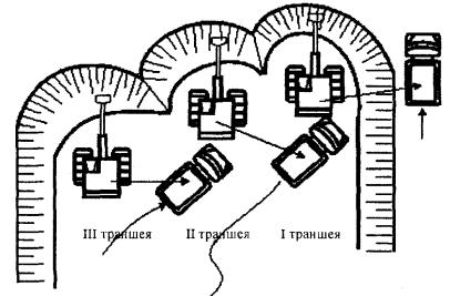 где V - объем грунта, который может переместить бульдозер за один проход, м3; B - ширина отвала бульдозера, м; z - перекрытие следа (0,25 - 0,3 м); h - толщина растительного слоя, м. В дальнейшем срезанный растительный грунт используют для укрепления откосов земляного полотна. Основание насыпи уплотняют катком ДУ-101 за 4 прохода по одному следу. При уплотнении каждый предыдущий след перекрывают последующим на 1/3 его ширины. Движение катка осуществляют по круговой схеме. Основание насыпи должно иметь коэффициент уплотнения не ниже 0,98. 2.4. Технологической картой предусмотрено возведение насыпи земляного полотна с разработкой грунта экскаваторами ЭО-4225 и транспортировкой автомобилями-самосвалами КамАЗ-55111 на расстояние 1,5 км. Разработку грунтового карьера экскаваторами «прямая лопата» производят по схеме (рис. 3). Рис. 3. Схема разработки грунтового карьера Сечение забоя устанавливают в соответствии с рабочими характеристиками выбранного типа экскаватора (рис. 4). При принятой схеме разработки грунтового карьера экскаватором вначале устраивается сквозная поперечная траншея, транспортные средства в этом случае размещаются выше уровня стоянки экскаватора. В дальнейшем разработка карьера ведется продольными проходами. Глубина первой