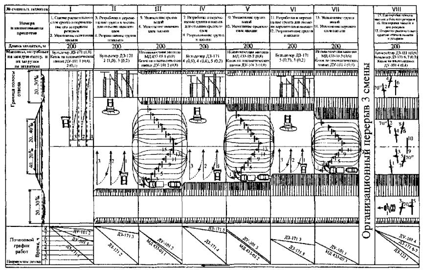 Рис. 5. Технологический план потока по возведению насыпи земляного полотна автомобильных дорог из грунта боковых резервов бульдозером Таблица 4 Состав отряда