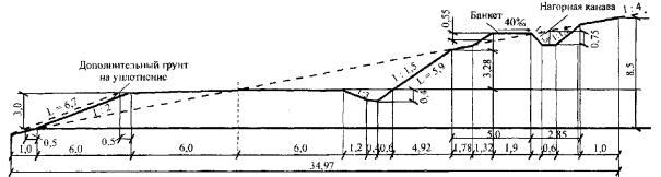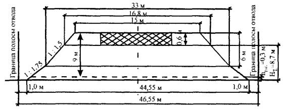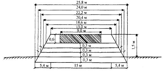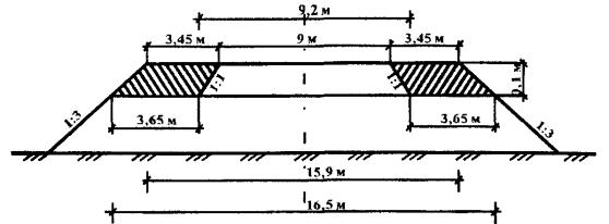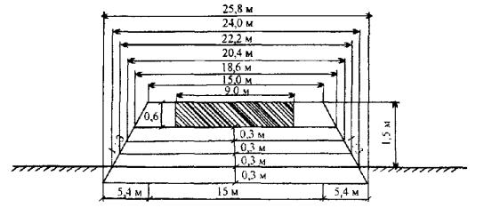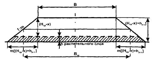 где V - общий объем земляных работ на линейном участке, м3; Kв - 0,80 - 0,90 - коэффициент внутрисменного использования рабочего времени для различных землеройных машин. Рис. 1. Осредненный поперечник земляного полотна для участка линейных работ Примечание. Осредненный поперечник земляного полотна для участка линейных работ (рис. 1) предполагает возведение земляного полотна с присыпными обочинами. При этом насыпь отсыпают несколько шире (на «mx» с каждой стороны), чем предусмотрено проектной отметкой и ниже на величину «x»