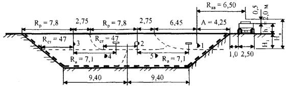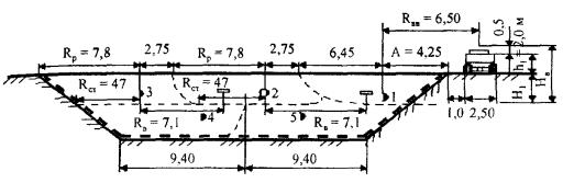 сквозная поперечная траншея Рис. 2. Схема разработки грунтового карьера Рис. 3. Сечение грунтового карьера (размеры в м): Rр - наибольший радиус