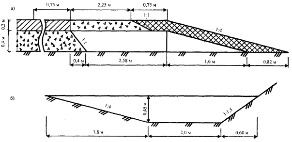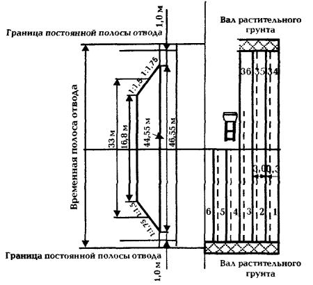 При производстве работ по устройству земляного полотна бульдозером руководствуются следующей технической литературой: 1. СНиП III-4-80. Техника безопасности в строительстве. 2. СНиП 12-03-2001. Безопасность труда в строительстве. Часть 1. Общие требования. 3. ТОИ Р-218-05-93. Типовая инструкция по охране труда для машиниста автогрейдера (прицепного грейдера). 4. ТОИ Р-218-07-93. Типовая инструкция по охране труда для машиниста катка. 5. ТОИ Р-218-26-94. Типовая инструкция по охране труда для машиниста автополивомоечной машины. 6. ТОИ Р-218-08-93. Типовая инструкция по охране труда для машиниста скрепера. 7. Спельман Е.П. Техника безопасности при эксплуатации строительных машин и средств малой механизации. - М.: Стройиздат, 1986. - 271 с.: ил. Технологическая карта № 3ВОЗВЕДЕНИЕ НАСЫПИ ЗЕМЛЯНОГО ПОЛОТНА АВТОМОБИЛЬНЫХ ДОРОГ ВЫСОТОЙ ДО 1,5 м С РАЗРАБОТКОЙ ГРУНТА В КАРЬЕРЕ ЭКСКАВАТОРАМИ ЭО-4225 И ТРАНСПОРТИРОВКОЙ АВТОМОБИЛЯМИ-САМОСВАЛАМИ1. ОБЛАСТЬ ПРИМЕНЕНИЯ Технологическая карта разработана на основе методов научной организации труда и предназначена для использования при разработке проектов производства работ и организации труда на строительном объекте. Технологическая карта составлена на возведение насыпи земляного полотна высотой 1,5 м при разработке грунта II группы экскаваторами типа ЭО-4225 с вместимостью ковша 1,25 м3 и перевозке грунта автомобилями-самосвалами. Для транспортировки грунта в данном технологическом процессе приняты автомобили-самосвалы КамАЗ-55111. Во всех случаях применения технологической карты необходима привязка ее к конкретным условиям производства работ с учетом имеющихся материально-технических ресурсов. 2. ОРГАНИЗАЦИЯ И ТЕХНОЛОГИЯ ПРОИЗВОДСТВА РАБОТ 2.1. До возведения земляного полотна необходимо: · восстановить и закрепить трассу дороги и полосу отвода; · расчистить территорию в пределах полосы отвода от кустарников, пней и валунов; · произвести разбивку земляного полотна и грунтового карьера; · устроить временные землевозные дороги для транспортирования грунта; · устроить съезды в забой и выезды из него; · обеспечить отвод поверхностных и грунтовых вод от забоя; · устроить освещение забоя и отвалов при работе в темное время суток. 2.2. Работы по возведению земляного полотна (рис. 1) из сосредоточенного грунтового карьера при разработке грунта экскаваторами ЭО-4225 и транспортировании в насыпь автомобилями-самосвалами КамАЗ-55111 на среднее расстояние 2,5 км ведутся в разработанной технологической последовательности процессов производства работ (табл. 3) на 5 захватках длиной 200 м. Рис. 1. Конструкция земляного полотна в поперечном профиле Длина захватки при выполнении работ по отделке земляного полотна принята 800 м. 2.3. На первой захватке выполняются следующие технологические операции: · срезка растительного слоя грунта бульдозером; · уплотнение основания насыпи пневмокатком. Толщину срезаемого растительного слоя грунта устанавливают по согласованию с землепользователем. В карте принята толщина этого слоя 30 см. Работы в данной технологической карте выполняют бульдозером ДЗ-171 по поперечной схеме. Грунт срезают от оси дороги поперечными проходами бульдозера, перекрывая каждый предыдущий след на 0,25 - 0,3 м, и перемещают за пределы полосы отвода. В дальнейшем срезанный растительный грунт используют для укрепления откосов земляного полот