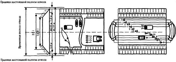 3. БЕЗОПАСНОСТЬ ТРУДА Требования техники безопасности для одноковшовых экскаваторов являются общими и выполняются независимо от типа машин и вида сменного рабочего оборудования. Для работы экскаватор устанавливают на твердом, заранее спланированном основании (площадке) с уклоном, не превышающим допустимой величины, обусловленной техническим паспортом. Для предупреждения опасности самопроизвольного смещения (откатывания) под гусеницы подкатывают инвентарные упоры. Ожидающие погрузки транспортные средства должны находиться за пределами радиуса действия ковша экскаватора не ближе 5 м, становиться под погрузку и отъезжать после ее окончания только с разрешающего сигнала машиниста. Погрузка в автотранспорт производится со стороны заднего или бокового борта. При погрузке вязких грунтов в кузов автомобиля-самосвала вначале грузят сухой грунт. Для предотвращения поломок транспортных средств грунт высыпают с минимальной высоты, допускающей беспрепятственное открывание днища ковша, при этом грунт равномерно распределяют по кузову и следят, чтобы он не пересыпался через борта. При производстве работ по устройству земляного полотна бульдозером руководствуются следующей технической литературой: 1. СНиП III-4-80. Техника безопасности в строительстве. 2. СНиП 12-03-2001. Безопасность труда в строительстве. Часть 1. Общие требования. 3. ТОИ Р-218-05-93. Типовая инструкция по охране труда для машиниста автогрейдера (прицепного грейдера). 4. ТОИ Р-218-07-93. Типовая инструкция по охране труда для машиниста катка. 5. ТОИ Р-218-26-94. Типовая инструкция по охране труда для машиниста автополивомоечной машины. 6. ТОИ Р-218-25-94. Типовая инструкция по охране труда для машинистов одноковшовых гусеничных и пневмоколесных экскаваторов. 7. Спельман Е.П. Техника безопасности при эксплуатации строительных машин и средств малой механизации. - М.: Стройиздат, 1986. - 271 с.: ил. Технологическая карта № 8ГЕОДЕЗИЧЕСКИЕ РАБОТЫ ПРИ УСТРОЙСТВЕ ЗЕМЛЯНОГО ПОЛОТНА1. ОБЛАСТЬ ПРИМЕНЕНИЯ Технологическая карта разработана для производства геодезических работ при устройстве земляного полотна в зависимости от форм рельефа. 2. ТЕХНОЛОГИЯ И ОРГАНИЗАЦИЯ ПРОИЗВОДСТВА РАБОТ 2.1. Восстановление и закрепление трассы дороги Восстановление трассы производится с целью закрепления на местности всех основных точек, определяющих положение проектной линии дороги. При этом руководствуются документами рабочего проекта: планом и профилем трассы, ведомостью прямых и кривых, схемой закрепления трассы. В состав работ по восстановлению трассы входят: · инструментальное восстановление пикетажа с контрольным промером линий и углов и с детальной разбивкой кривых; · закрепление трассы с выносом знаков крепления за пределы зоны земляных работ; · контрольное нивелирование по пикетажу с дополнительным сгущением сети рабочих реперов; · возможная корректировка и местное улучшение трассы. Восстановление трассы начинают с отыскания на местности вершин углов поворота. Отдельные вершины, на которых не сохранились знаки крепления, находят промерами от постоянных местных предметов согласно абрисам их привязки или прямой засечкой по проектным углам из двух соседних вершин трассы. Одновременно с восстановлением вершин измеряют углы поворота трассы и сравнивают полученные значения с проектными. При обнаруж