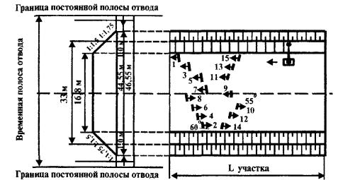 = l2 = где B - проектная ширина земляного полотна; ho - глубина выемки в точке А1; hн - высота насыпи; hk - глубина кювета; 1:m1 - крутизна (уклон) откоса насыпи; 1:m2 - крутизна (уклон) откоса выемки; 1:n - уклон местности. D - ширина кювета поверху; C - дно кювета. Величина D определяется по формуле D = D1 + D2 + С = m3hн + m2hk + С. Рис. 9 Положение точек А, А1 находится путем откладывания по наклонной местности отрезков ОА'1 и ОА'. Эти отрезки вычисляются по формулам: О'А'1 = (B + 2D)/2cosv, ОА' = B+/2cosv, где v - угол наклона местности. Все точки закрепляют соответствующими геодезическими знаками (см. рис. 1). Высотники под № 1 и № 2 выставляют с помощью нивелира через 50 м на прямых участках с двух сторон дороги на границе полосы отвода. На горизонтальных и вертикальных круговых кривых высотники выставляются через 25 м. Осевые геодезические знаки под № 3 выставляют с помощью теодолита на оси дороги через 100 м на прямых участках и через 50 м - на горизонтальных круговых кривых. Геодезические знаки № 5 выставляются с помощью теодолита через 50 м на прямых участках дороги и через 20 м - на горизонтальных и вертикальных круговых кривых. Геодезический знак № 8 выставляется с помощью шаблона, имеющего заданный (проектный) уклон. Геодезический знак № 4, обозначающий водоотвод земляного полотна (дно кювета), выставляется через 50 м на прямых участках дороги и через 20 м на горизонтальных и вертикальных круговых кривых. Надпись на знаке (например, 1,45 м) обозначает глубину срезки от основания геодезического знака до дна кювета. Схема организации разбивочных работ на захватке приведена на рис. 10. Рис. 10. Схема организации разбивочных работ при разработке полунасыпи-полувыемки: 1 - высотник насыпи; 2 - высотник срезки; 3 - осевой геодезический знак; 4 - обозначение водоотвода земляного полотна (дно кювета); 5 - обозначение ширины насыпи; 8 - обозначение подошвы земляного полотна и уклона насыпи По земляному полотну проводят исполнительную съемку. Инструментально восстанавливают продольную ось, и на каждом пикете проверяют ширину корыта, обочин, а также крутизну откосов. Производят контрольное нивелирование, и проверяют на всех пикетах и переломах продольного профиля отметки по оси и обеим бровкам. По окончании разбивочных работ для строительства оформляется акт о производстве геодезических разбивочных работ, что является разрешением для проведения строительно-монтажных работ. Во время производства земляных работ должны быть приняты меры по обеспечению сохранности знаков разбивки. Все поврежденные в процессе работ знаки должны немедленно восстанавливаться. 3. ОТКЛОНЕНИЯ (±) ГЕОМЕТРИЧЕСКИХ ПАРАМЕТРОВ ПРИ УСТРОЙСТВЕ ЗЕМЛЯНОГО ПОЛОТНА Таблица 4