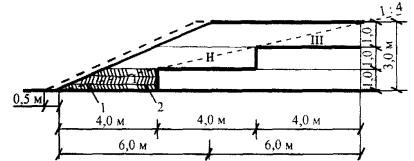 3. БЕЗОПАСНОСТЬ ТРУДА Требования техники безопасности для одноковшовых экскаваторов являются общими и выполняются независимо от типа машин и вида сменного рабочего оборудования. Для работы экскаватор устанавливают на твердом, заранее спланированном основании (площадке) с уклоном, не превышающим допустимой величины, обусловленной техническим паспортом. Для предупреждения опасности самопроизвольного смещения (откатывания) под гусеницы подкладывают инвентарные упоры. Ожидающие погрузки транспортные средства должны находиться за пределами радиуса действия ковша экскаватора не ближе 5 м, становиться под погрузку и отъезжать после ее окончания только с разрешающего сигнала машиниста. Погрузка в автотранспорт производится со стороны заднего или бокового борта. При погрузке разных по свойствам грунтов в кузов автомобиля-самосвала вначале грузят сухой, затем вязкий грунт. Для предотвращения поломок транспортных средств грунт высыпают с минимальной высоты, допускающей беспрепятственное открывание днища ковша, при этом грунт равномерно распределяют по кузову и следят, чтобы он не пересыпался через борта. При производстве работ по устройству земляного полотна бульдозером руководствуются следующей технической литературой: 1. СНиП III-4-80. Техника безопасности в строительстве. 2. СНиП 12-03-2001. Безопасность труда в строительстве. Часть 1. Общие требования. 3. ТОИ Р-218-05-93. Типовая инструкция по охране труда для машиниста автогрейдера (прицепного грейдера). 4. ТОИ Р-218-07-93. Типовая инструкция по охране труда для машиниста катка. 5. ТОИ Р-218-26-94. Типовая инструкция по охране труда для машиниста автополивомоечной машины. 6. ТОИ Р-218-25-94. Типовая инструкция по охране труда для машинистов одноковшовых гусеничных и пневмоколесных экскаваторов. 7. Спельман Е.П. Техника безопасности при эксплуатации строительных машин и средств малой механизации. - М.: Стройиздат, 1986. - 271 с.: ил. Технологическая карта № 6ВОЗВЕДЕНИЕ ЗЕМЛЯНОГО ПОЛОТНА ТИПА ПОЛУВЫЕМКА-ПОЛУНАСЫПЬ1. ОБЛАСТЬ ПРИМЕНЕНИЯ 1.1. Технологическая карта разработана на основе методов научной организации труда и предназначена для использования при составлении проектов производства работ и организации труда на строительных объектах. Карта составлена на возведение земляного полотна шириной 12 м и высотой 3 м типа полувыемка-полунасыпь на косогоре крутизной 1:4. В качестве ведущего механизма принят бульдозер ДЗ-171 с разработкой грунта II группы. Во всех случаях применения технологической карты необходима привязка ее к местным условиям. 1.2. В состав работ входят: · срезка растительного слоя грунта в пределах полосы отвода; · устройство нагорной канавы; · нарезка уступов; · разработка грунта в выемке с перемещением в насыпь; · послойное разравнивание грунта; · увлажнение уплотняемого слоя грунта водой (при необходимости); · послойное уплотнение грунта в насыпи; · срезка рыхлого грунта с откоса насыпи и планировка его поверхности; · планировка верха земляного полотна; · окончательное уплотнение верха земляного полотна. 1.3. Недопустимо отсыпать насыпь на косогоре до устройства продольных водоотводных канав (нагорной канавы). 2. ОРГАНИЗАЦИЯ И ТЕХНОЛОГИЯ ПРОИЗВОДСТВА РАБОТ 2.1. До возведения земляного полотна типа полувыемка-полунасыпь (рис. 1) необходимо: · восстановить и закрепить трассу дороги; · разби