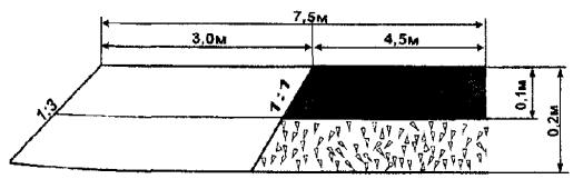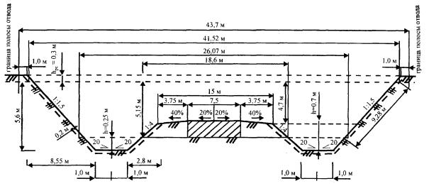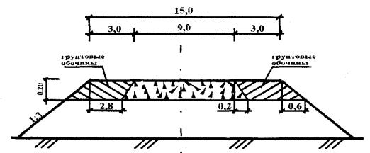 где V - объем грунта, который может переместить бульдозер за один проход, м3; B - ширина отвала бульдозера, м; z - перекрытие следа (0,25 - 0,3 м); h - толщина растительного слоя, м. В дальнейшем срезанный растительный грунт используют для укрепления откосов земляного полотна. 2.4. Разработку выемки экскаваторами производят до отметки, ниже проектной на толщину дорожной одежды. Грунт в выемке разрабатывают с недобором для предотвращения нарушения структуры грунта в основании. Допускаемый недобор грунта при разработке выемки экскаватором ЭО-4225 - 0,1 - 0,2 м. Объем сосредоточенных земляных работ для принятого поперечного профиля земляного полотна, изображенного на рис. 1, составляет 51970 м3. Толщина дорожной одежды принята 0,6 м. Основные объемы работ рассчитаны для участка сосредоточенных работ длиной 300 м. Таблица 1 Технологическая последовательность процессов с расчетом объемов работ и потребных ресурсов