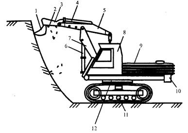 Рис. 4. Схема работы экскаватора «прямая лопата»: 1 - ковш; 2 - гидроцилиндр ковша; 3 - рукоять; 4 - гидроцилиндр рукояти; 5 - стрела; 6 - гидроцилиндр стрелы; 7 - дополнительная нижняя часть стрелы; 8 - кабина; 9 - силовая установка; 10 - противовес; 11 - ходовая часть; 12 - опорно-поворотный круг 2.7. Транспортировку грунта из карьера в насыпь производят автомобилями-самосвалами КамАЗ-55111. Количество транспортных средств, необходимых для перевозки грунта, определяют расчетом с учетом фактических условий работы и дальности возки. В каждый автомобиль-самосвал КамАЗ-55111 загружают 7,5 м3 грунта. Грунт транспортируют до места производства работ и выгружают через каждые 5 м вдоль насыпи и через каждые 5 м по ее ширине (рис. 5). Расстояние между центрами куч вдоль насыпи определяют по формуле