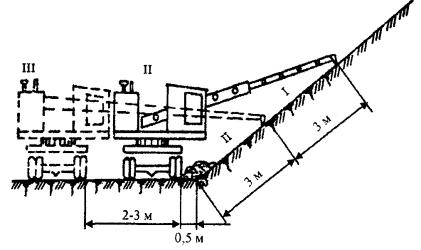 траншея Глубина первой пионерной траншеи (см. рис. 3) определяется из условия обеспечения погрузки грунта в автомобиль-самосвал при использовании наибольшей высоты выгрузки H1 = Hв - 0,5 - h1, где Hв - наибольшая высота выгрузки, м; 0,5 -расстояние по высоте между днищем ковша и верхом борта автомобиля, м; h1 - погрузочная высота автомобиля-самосвала, м. Расстояние от кромки разрабатываемой траншеи до оси прохода экскаватора определяется по условиям обеспечения погрузки грунта в автомобиль-самосвал при использовании наибольшего радиуса выгрузки A = Rвв - 1 - b/2, где Rвв - наибольший радиус выгрузки при наибольшей высоте выгрузки, м; 1 - безопасный зазор между кромкой выемки и колесом автомобиля-самосвала, м; b - ширина базы автомобиля-самосвала, м. Ось прохода экскаватора при разработке второй траншеи должна располагаться на расстоянии Rв от оси движения автомобиля-самосвала, который в нашем случае будет двигаться на уровне основания пионерной траншеи. При разработке третьей траншеи положение оси прохода определяется размещением транспортных средств, которые будут двигаться на уровне стоянки экскаватора. При разработке четвертой траншеи автомобили-самосвалы размещаются на уровне основания первого яруса и при разработке пятой траншеи - на уровне стоянки экскаватора. Подобными расчетами можно определить количество проходов экскаватора и разработать схему его работы при любых исходных данных и размерах выемки. Уклоны дна проходок должны предотвращать приток и скопление в забоях грунтовых и поверхностных вод. Рабочий цикл экскаватора с прямой лопатой состоит из следующих операций (рис. 5): · копания грунта (движение стрелы, рукояти и ковша); · поворота на разгрузку (поворота платформы со всем рабочим оборудованием); · разгрузки (открывания днища ковша или поворота ковша относительно рукояти); · поворота в забой; · опускания стрелы и рукояти с ковшом на подошву забоя. 2.5. Планировку верха земляного полотна выполняют автогрейдером ДЗ-122 за 4 прохода по одному следу по челночной схеме. Угол захвата ножа автогрейдера должен быть 35 - 70°, а угол наклона - в зависимости от проектного поперечного профиля (рис. 6). Рис. 5. Схема работы экскаватора «прямая лопата»: 1 - ковш; 2 - гидроцилиндр ковша; 3 - рукоять; 4 - гидроцилиндр рукояти; 5 - стрела; 6 - гидроцилиндр стрелы; 7 - дополнительная нижняя часть стрелы; 8 - кабина; 9 - силовая установка; 10 - противовес; 11 - ходовая часть; 12 - опорно-поворотный круг Рис. 6. Доработка выемки до проектных очертаний 2.6. Основание выемки уплотняют катком ДУ-101 за 4 прохода по одному следу. При уплотнении каждый предыдущий след перекрывают последующим на 1/3 его ширины. Движение катка осуществляют по круговой схеме (см. рис. 6). Земляное полотно должно иметь коэффициент уплотнения не ниже 0,98. 2.7. При планировке откосов выемки длиной до 10 м используют экскаватор-планировщик ЭО-3533 гидравлический. Откосы выемки планируют за 3 прохода экскаватора по участку работ: I - при первом проходе (верхняя стоянка экскаватора) планируют верхнюю часть откоса (рис. 7); II - при втором - среднюю; III - при третьем - нижнюю (рис. 8). Рис. 7. Планировка верхней части откоса выемки при верхней стоянке экскаватора ЭО-3533 После планировки на одном месте экскаватор перемещают вдоль бровки откоса на 2 м и планируют очередной участок, перекрывая предыдущий на 30 - 50 см. Излишки грунта, о
