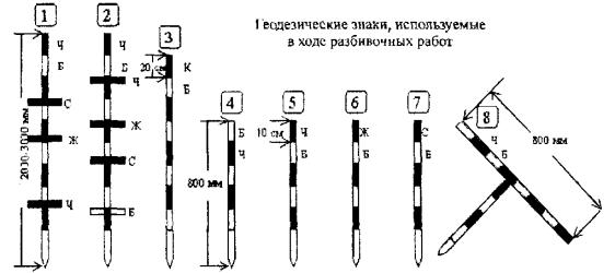 Возможны корректировка и улучшение расположения трассы на местности для уменьшения объема земляных работ и увеличения устойчивости отдельных сооружений. Так, могут быть спрямлены некоторые участки, найден более удачный переход или обход мест, не устойчивых в геологическом отношении, более удачно размещены искусственные сооружения, несколько изменены радиусы кривых и уклоны продольного профиля. Все изменения, внесенные в проект при восстановлении трассы, передаются в проектную организацию для утверждения. 2.2. Разбивочные работы Разбивку выполняют на основании данных проекта (продольный профиль, поперечные профили насыпей, план трассы), уточненных в процессе восстановления трассы по рабочим чертежам. Разбивка состоит в обозначении на местности в плане и по высоте всех характерных точек поперечного профиля полотна: оси, бровок, кюветов, подошвы насыпей. При разбивке выполняются следующие работы: · инструментальная разбивка поперечника на местности; · закрепление пикетов и плюсов выносными точками. Знаки для разбивочных работ приведены на рис. 1. Детальную разбивку земляного полотна выполняют в следующей последовательности: · вдоль восстановленной трассы выделяют основные проектные участки между смежными переломами плана и продольного профиля трассы; · в характерных переломах профиля земной поверхности восстанавливают поперечники или нормали к кривым и устанавливают границы земляного полотна с выделением его бровок; · производят зачистку или пропашку границ откосов и выемок, расстановку и закрепление разбивочных знаков (вех, вех-визирок, откосников и др.) для производства основных земляных работ; · разбивочные знаки устанавливают раздельно для каждого проектного участка за пределами работ; · одновременно устанавливают места размещения приборов для геодезического управления работой строительных машин. Рис. 1. Геодезические знаки, используемые в ходе разбивочных работ: 1 - высотник насыпи; 2 - высотник срезки; 3 - осевой геодезический знак; 4 - обозначение водоотвода земляного полотна (дно кювета); 5 - обозначение ширины насыпи; 6 - обозначение ширины подстилающего слоя; 7 - обозначение ширины щебеночного основания; 8 - обозначение подошвы земляного полотна и уклона насыпи; К - красный; Ж - желтый; Б - белый; С - синий; Ч - черный цвета Поперечники разбивают на прямолинейных участках трассы через 20 - 40 м и на всех переломах продольного профиля. Для этого в створе оси разбивают между пикетами плюсовые точки, которые служат осевыми точками поперечников. Сами же поперечники разбивают вправо и влево от этих точек, перпендикулярно к оси трассы. На закруглениях трассы поперечники разбивают через 10 - 20 м по направлению к центру кривой. Одновременно с разбивкой поперечников выносят в натуру красные (проектные) отметки. Проектная отметка дороги соответствует бровке земляного полотна в законченном виде. В зависимости от рельефа местности земляное полотно может быть устроено возведением насыпи или разработкой выемки. 2.2.1. Возведение земляного полотна высотой до 1,5 м из боковых резервов При разбивке поперечных профилей в насыпи (рис. 2) на местности закрепляют положение осевой точки О', проекции бровок А', А'1 и подошвы насыпи Б, Б1. Если поперечный уклон местности не больше 3 - 4°, то можно принять О'А'1 = О'А' = B/2 и А'Б = А'1Б1 = hm, где B - проектная