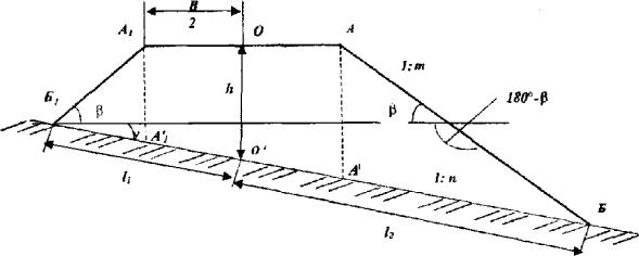 = l1 = и О'Б = l2 = где B - проектная ширина земляного полотна; h - высота насыпи по оси; 1: m - крутизна (уклон) откоса; 1:n - уклон местности. Рис. 4 Положение точек А, А1 находится путем откладывания по наклонной местности отрезков О'А'1 и О'А'. Эти отрезки вычисляются по формуле О'А'1 = О'А' = B/2cosv, где v - угол наклона местности. Все точки закрепляют соответствующими геодезическими знаками (см. рис. 1). Высотники под № 1 выставляют с помощью нивелира через 50 м на прямых участках с двух сторон дороги на границе полосы отвода. На горизонтальных и вертикальных круговых кривых высотники выставляются через 25 м. Осевые геодезические знаки под № 3 выставляют с помощью теодолита на оси дороги через 100 м на прямых участках и через 50 м на горизонтальных круговых кривых. Геодезические знаки № 5 выставляются с помощью теодолита через 50 м на прямых участках дороги и через 20 м на горизонтальных и вертикальных круговых кривых. Геодезический знак № 8 выставляется с помощью шаблона, имеющего заданный (проектный) уклон. Геодезические знаки расставляются по схеме, приведенной на рис. 3. 2.2.3. Возведение земляного полотна на косогоре крутизной от 1:5 до 1:3 При разбивке поперечных профилей в насыпи (рис. 5) на местности закрепляют положение осевой точки О, проекции бровок А', А'1 и подошвы насыпи Б, Б1. Положение точек Б и Б1 может быть найдено, если отложить по наклонной местности отрезки О'Б и О'Б1. Эти отрезки находят по формулам: О'Б1
