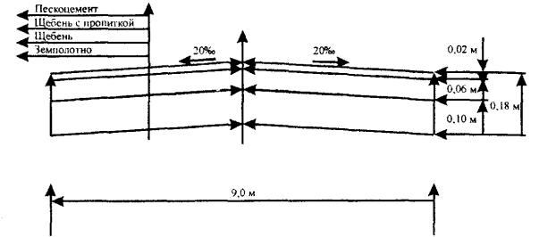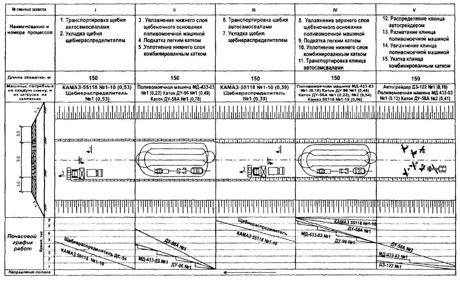 РАЗДЕЛ 2. УСТРОЙСТВО ОСНОВАНИЙ И ПОКРЫТИЙ ДОРОЖНЫХ ОДЕЖДТехнологическая карта № 9УСТРОЙСТВО ДВУХСЛОЙНОГО ЩЕБЕНОЧНОГО ОСНОВАНИЯ АВТОМОБИЛЬНЫХ ДОРОГ ПО МЕТОДУ ЗАКЛИНКИ1. ОБЛАСТЬ ПРИМЕНЕНИЯ 1.1. Технологическая карта разработана на устройство двухслойного щебеночного основания методом заклинки толщиной 30 см и шириной 9 м с применением распределителя дорожно-строительных материалов ДС-54, оборудованного рабочим органом щебнеукладчика. При отсутствии распределителя распределение щебня можно производить автогрейдером, оборудованным автоматической системой задания вертикальных отметок. Для устройства нижнего слоя основания толщиной 17 см применяют щебень фракции 70 - 120 мм, для верхнего слоя толщиной 13 см - щебень фракции 40 - 70 мм, для расклинивания - щебеночную смесь фракции 5 - 20 мм. Щебень должен удовлетворять требованиям действующей нормативной документации. 1.2. Конструкция основания принята в соответствии с альбомом «Типовые строительные конструкции, изделия и узлы серии 3.503-71/88 «Дорожные одежды для автомобильных дорог общего пользования». Выпуск 0, «Материалы для проектирования». 1.3. При устройстве двухслойного основания в состав работ входят: · распределение щебня для нижнего слоя основания; · уплотнение нижнего слоя основания; · распределение щебня для верхнего слоя основания; · уплотнение верхнего слоя основания; · распределение мелкого щебня (клинца) для расклинивания верхнего слоя основания; · уплотнение верхнего слоя основания по расклинивающей фракции. 1.4. Работы по устройству щебеночного основания выполняют при положительных температурах. Уплотнение щебня не рекомендуется производить в случае продолжительных осадков или переувлажнения слоя щебня и верхней части земляного полотна. 1.5. Во всех случаях применения технологической карты необходима привязка ее к местным условиям работы с учетом наличия дорожно-строительных машин и механизмов, уточнения объемов работ и калькуляции затрат труда. 2. ОРГАНИЗАЦИЯ И ТЕХНОЛОГИЯ ПРОИЗВОДСТВА РАБОТ 2.1. Перед устройством двухслойного щебеночного основания методом заклинки необходимо: · обеспечить готовность земляного полотна в соответствии с требованиями действующих строительных норм и правил, а также руководства по сооружению земляного полотна автомобильных дорог; · подготовить временные подъездные пути для подачи материалов к месту производства работ; · выполнить разбивочные работы, обеспечивающие соблюдение проектной толщины, ширины основания и поперечных уклонов; · обеспечить водоотвод; · устроить обочины для создания боковых упоров при уплотнении каменного материала. 2.2. Щебень доставляют на объект автомобилями-самосвалами в объеме, необходимом для устройства конструктивного слоя заданной толщины с учетом коэффициента запаса на уплотнение (в карте принято значение 1,3). Работы по устройству двухслойного щебеночного основания (рис. 1) по методу заклинки ведутся на пяти захватках длиной 150 м каждая (рис. 2). 2.3. В разработанной технологической последовательности производства работ (табл. 1) на первой захватке выполняются следующие операции: · доставка щебня фракции 70 - 120 мм для устройства нижнего слоя основания автосамосвалами КамАЗ-55118; · распределение щебня нижнего слоя основания самоходным распределителем ДС-54. При общей толщине двухслойного щебеночног