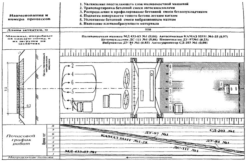 Технологический план потока по устройству цементобетонного покрытия приведен на рис. 1. Технология операционного контроля качества работ при устройстве цементобетонного покрытия приведена в табл. 3. Таблица 3 Технология операционного контроля качества работ при устройстве цементобетонного покрытия шириной 7,5 м и толщиной 0,2 м с использованием комплекта машин ДС-110