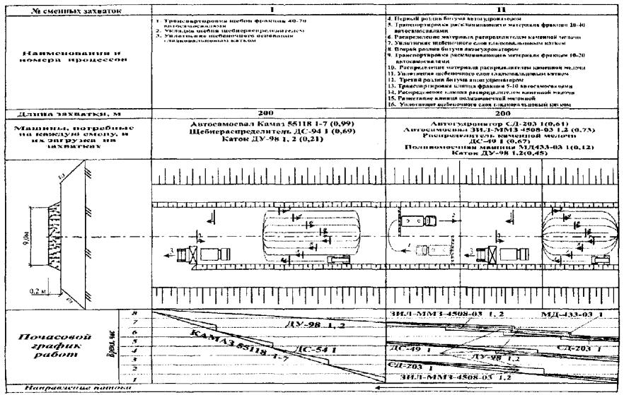 Для первой россыпи применяют щебень фракций 15 - 20 или 20 - 25 мм, для второй соответственно - фракций 5 - 10 или 10 - 15 мм. Основным требованием при выполнении поверхностной обработки является точное дозирование материалов, в соответствии с нормами расхода, установленными СНиП 3.06.03-85 «Автомобильные дороги» (табл. 15). Работы по устройству поверхностной обработки на битумных эмульсиях допускается выполнять при температуре воздуха не ниже 5 °С. При температуре воздуха ниже 20 °С следует применять эмульсии с концентрацией битума 55 - 60 % и температурой 40 - 50 °С. При температуре воздуха выше 20 °С подогревать эмульсию не следует, а концентрация битума может быть снижена на 50 %. В технологической карте принят механизированный способ выполнения работ с применением автогудронатора СД-203 и распределителя щебня WS 4100 Vario. Вместимость цистерны автогудронатора - 10000 л, бункера щебнераспределителя - 5 т. Во всех случаях применения технологической карты необходима привязка ее к конкретным условиям производства работ. 2. ОРГАНИЗАЦИЯ И ТЕХНОЛОГИЯ ПРОИЗВОДСТВА РАБОТ 2.1. До начала работ по устройству поверхностной обработки должно быть полностью завершено строительство дорожного покрытия и принято представителями технического надзора органа управления. При устройстве поверхностной обработки в рамках ремонта автомобильной дороги необходимо предварительно выполнить заделку трещин, выбоин, исправление кромок и устранение других повреждений. 2.2. Работы по устройству двойной поверхностной обработки ведутся в разработанной технологической последовательности процессов производства работ, представленной в табл. 2. 2.3. Скорость потока (длина сменной захватки) 1000 м/смену определена из условия наиболее полного использования автогудронатора СД-203 в течение смены (рис. 1). 2.4. Работы по устройству двойной поверхностной обработки с применением битумной эмульсии следует производить по чистой увлажненной водой (из расчета 0,5 л/м2) поверхности. Покрытие очищают от пыли и грязи за два прохода по одному следу поливомоечной машины МД-433-03. В первую очередь производят очистку самого покрытия, затем за один проход по каждой обочине пыль и мусор удаляют на откосы. Таблица 2 Технологическая последовательность процессов с расчетом объемов работ и потребных ресурсов
