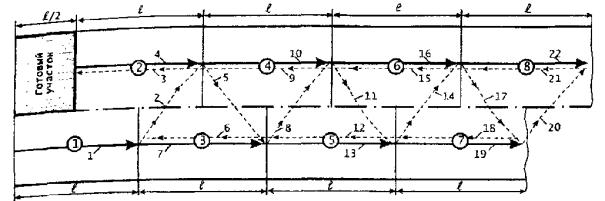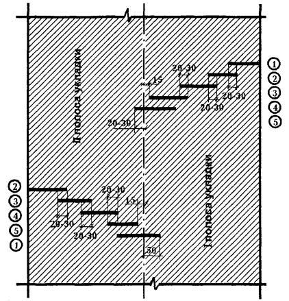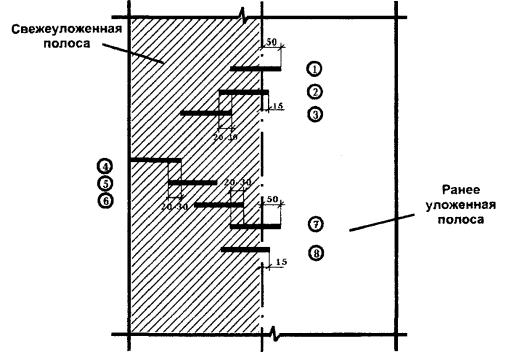 При работе одним асфальтоукладчиком уплотнение второй свежеуложенной полосы начинают по продольному сопряжению с ранее уложенной полосой (рис. 4). Уплотнение стыка следует начинать с наездом на «холодную» полосу на расстояние 50 см. Второй проход - с наездом 15 - 20 см. В таком случае основное уплотняющее воздействие оказывается на смесь, находящуюся в области стыка. Смесь подается в сторону стыка до тех пор, пока уровень свежеуложенной полосы не сравняется с уровнем соседней. В начале процесса уплотнения скорость катков должна быть 1,5 - 2 км/ч, а после пяти - шести проходов по одному следу ее увеличивают до 3,5 км/ч. При первом проходе гладковальцовых катков ведущие вальцы должны быть впереди. Во избежание образования неровностей не следует останавливать катки на горячей асфальтобетонной смеси. Рис. 4. Схема уплотнения асфальтобетонной смеси при работе одним асфальтоукладчиком (размеры в см):