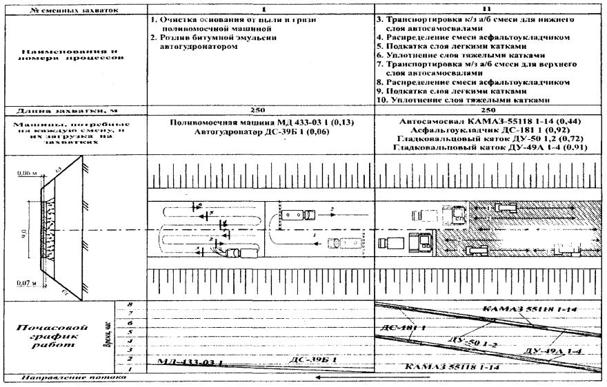 Рис. 5. Технологический план потока по устройству двухслойного асфальтобетонного покрытия Рис. 6. Технологический план потока по устройству двухслойного асфальтобетонного покрытия Таблица 5 Технология операционного контроля качества работ при устройстве асфальтобетонного покрытия